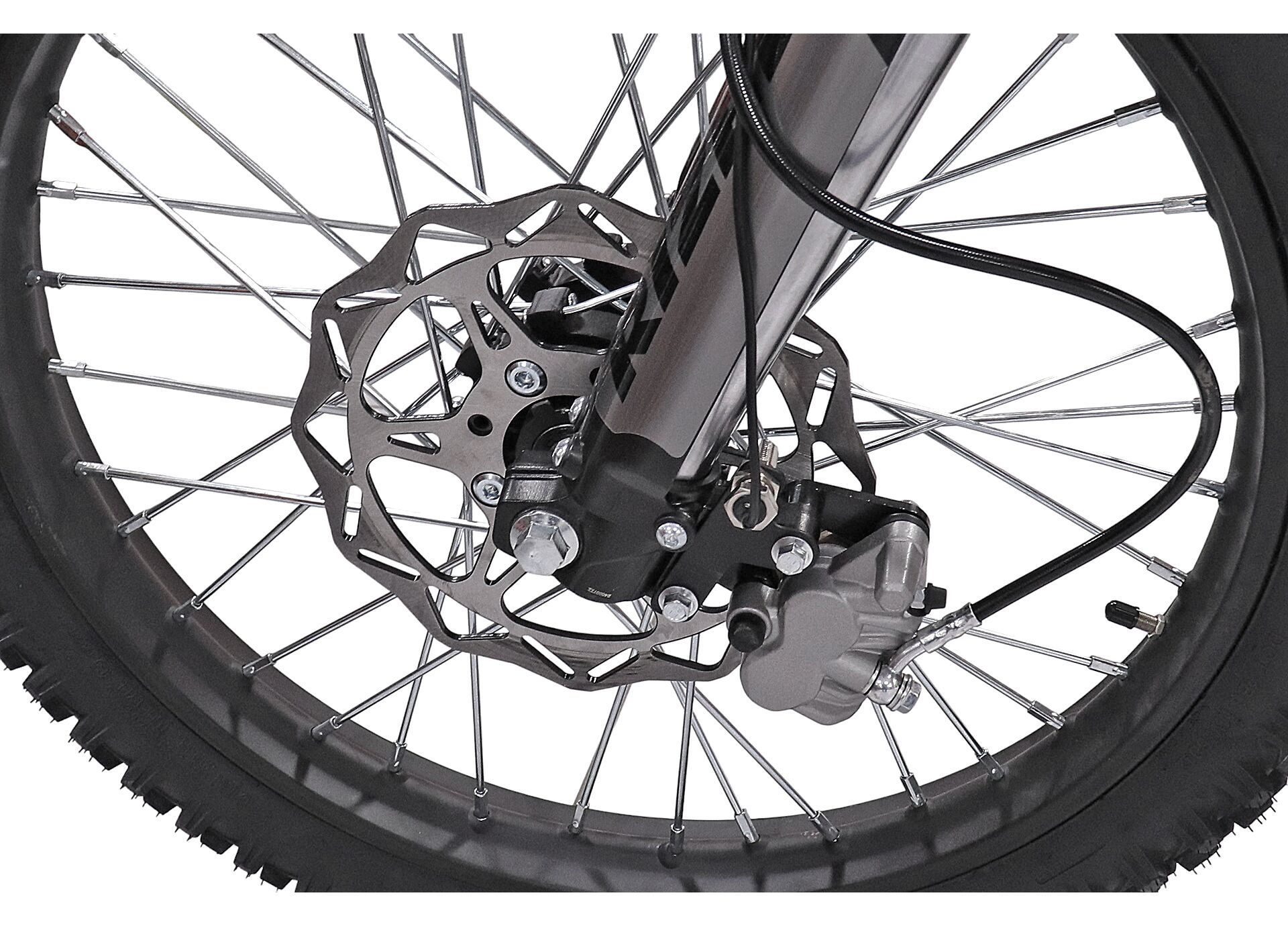 По оснащению предусмотрены фара и приборная панель: фара полезна, если вы катаетесь в сумерках или на лесных участках, а приборная панель позволяет контролировать основные показатели во время езды. На фото видно наличие дискового тормоза спереди — это добавляет предсказуемости при торможении на грунте.