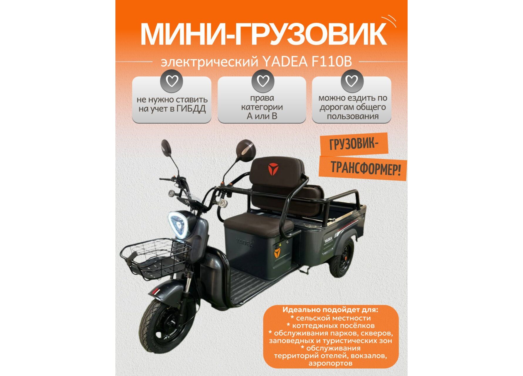 Yadea F110B подходит там, где нужно часто и спокойно перевозить груз: на территории предприятий, в складских помещениях и на рынках, в аэропортах и на вокзалах, а также в коттеджных посёлках, деревнях и на дачных участках. Трицикл не требует регистрации в ГИБДД, а для движения по общественным дорогам достаточно обычного водительского удостоверения любой категории.