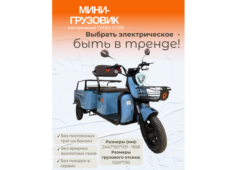 - КУПИТЕ С ДОСТАВКОЙ!Электрический мини-грузовик (грузовой трицикл) Yadea F110B для перевозки малогабаритных грузов на территориях предприятий, складов, рынков и в частном хозяйстве.