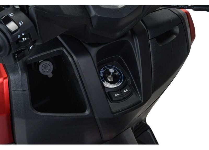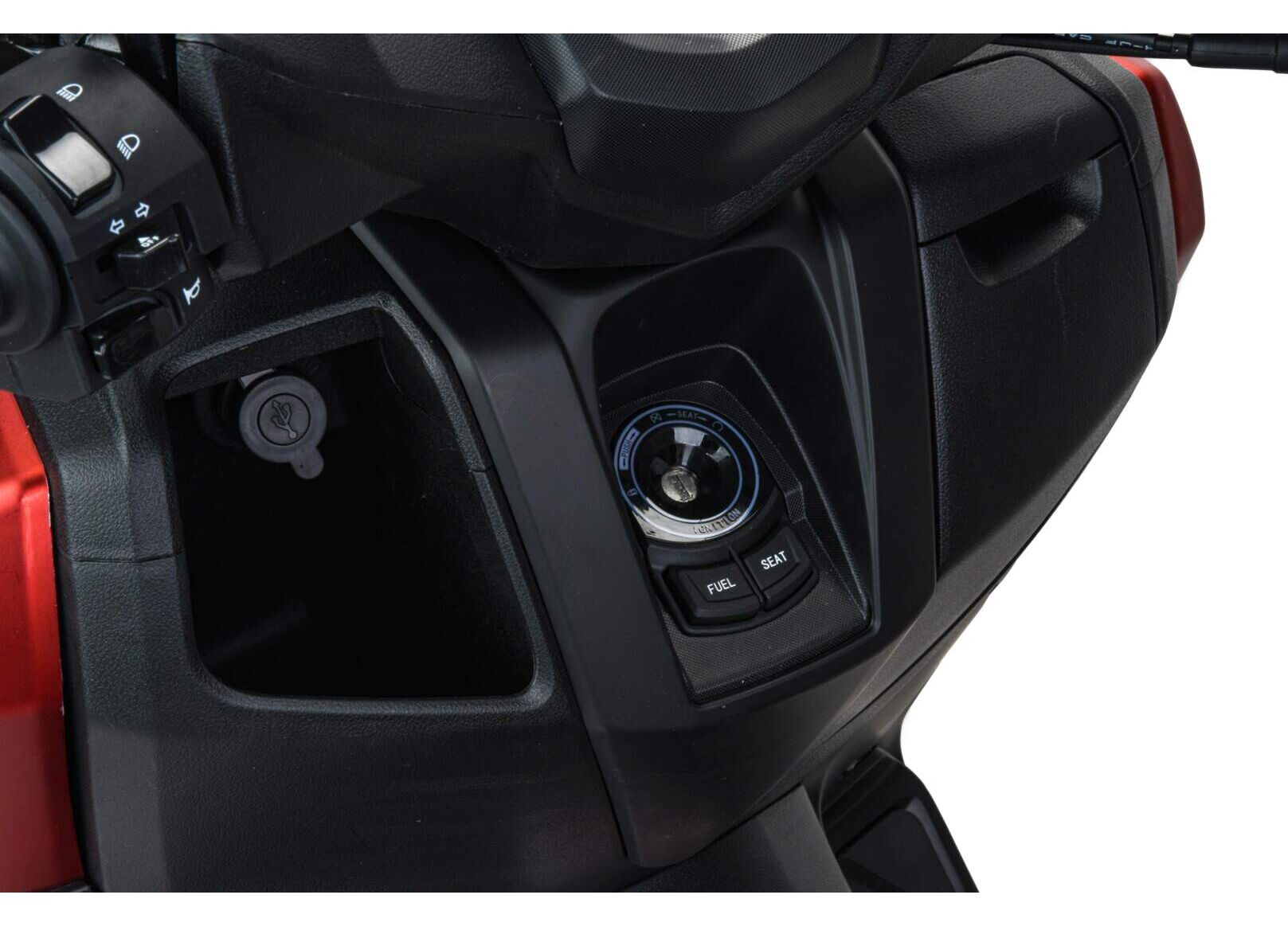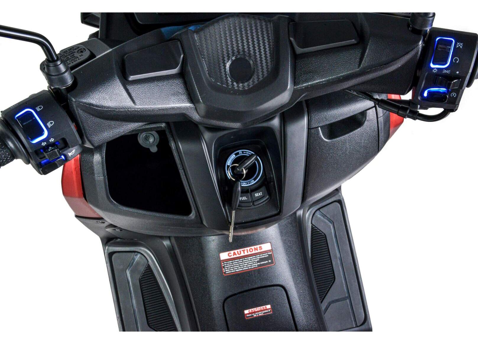 По практичности: широкое мягкое сиденье рассчитано на двоих, есть подножки пассажира. Вещи можно убрать в вместительный багажник под сиденьем (сиденье открывается с кнопки и закрывается на ключ). При этом внешнего багажника сзади нет.