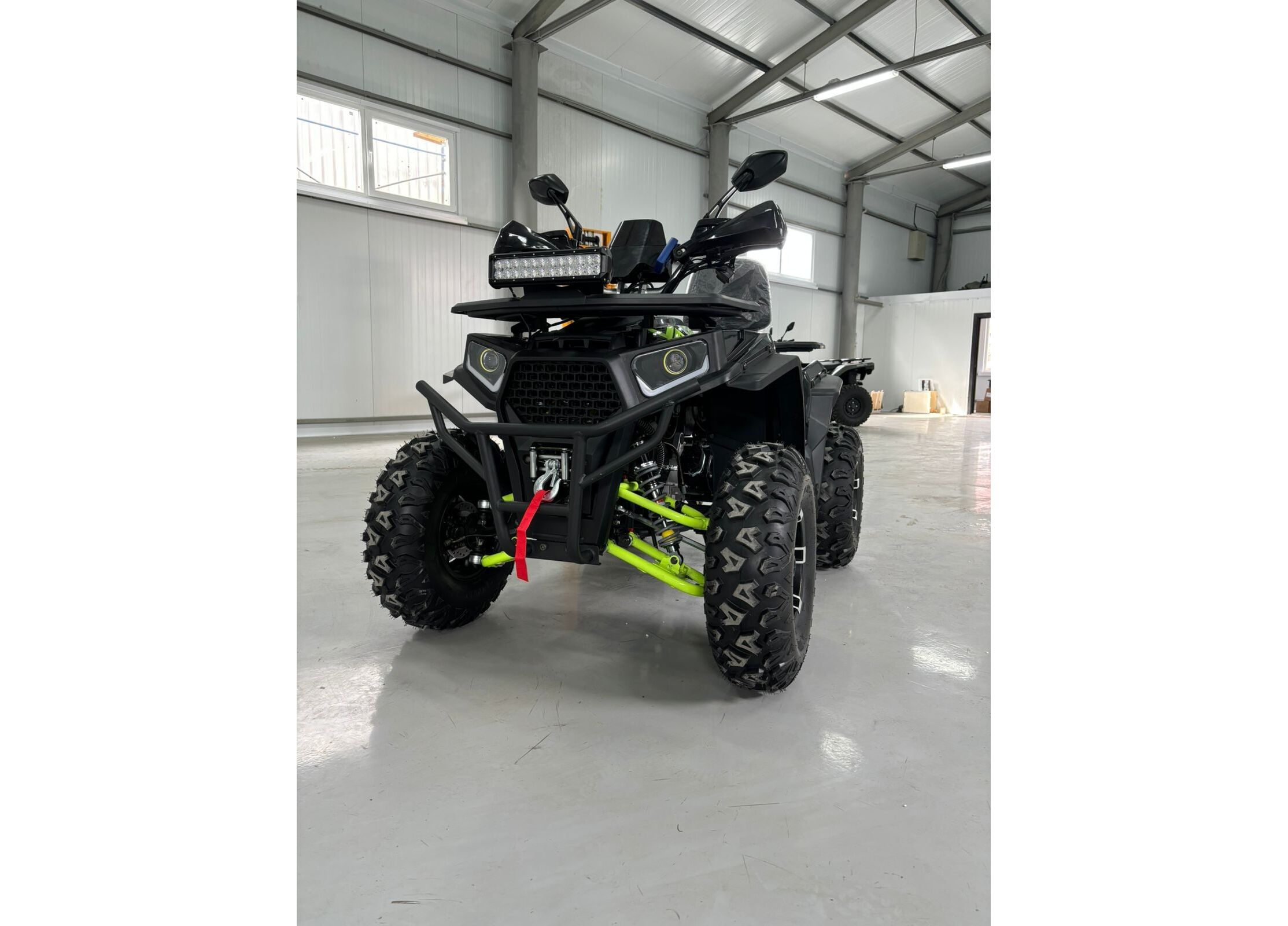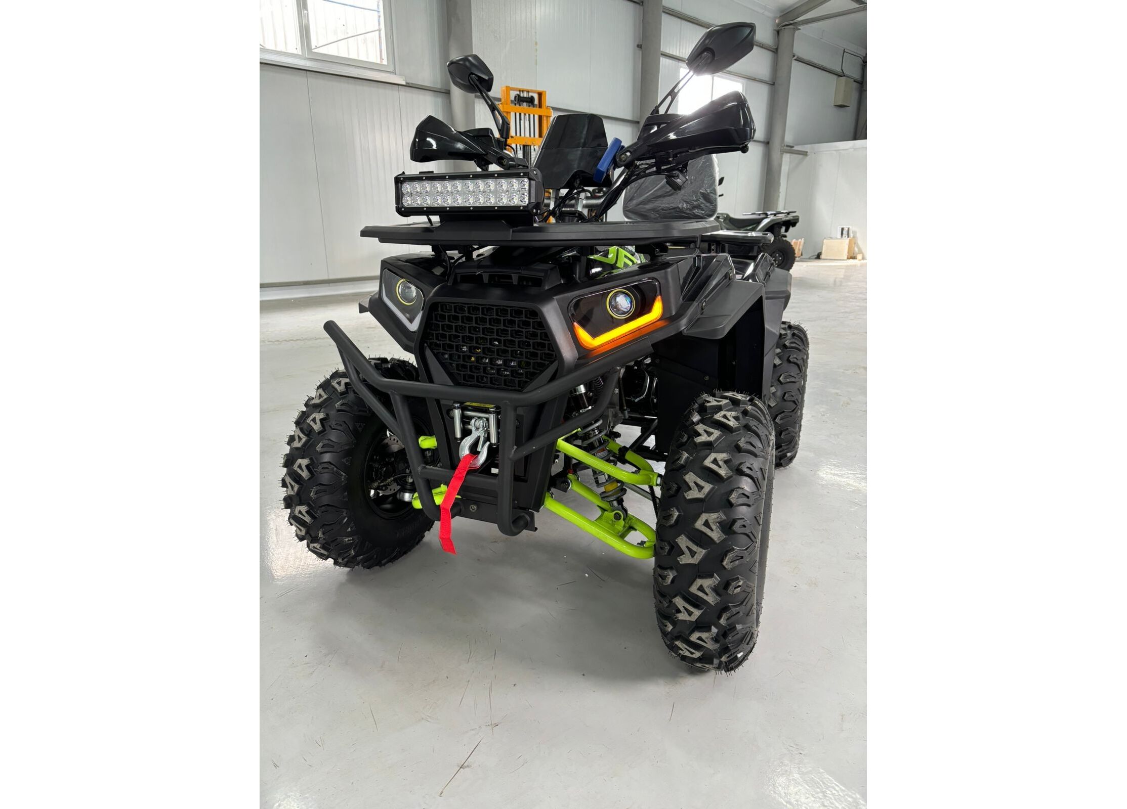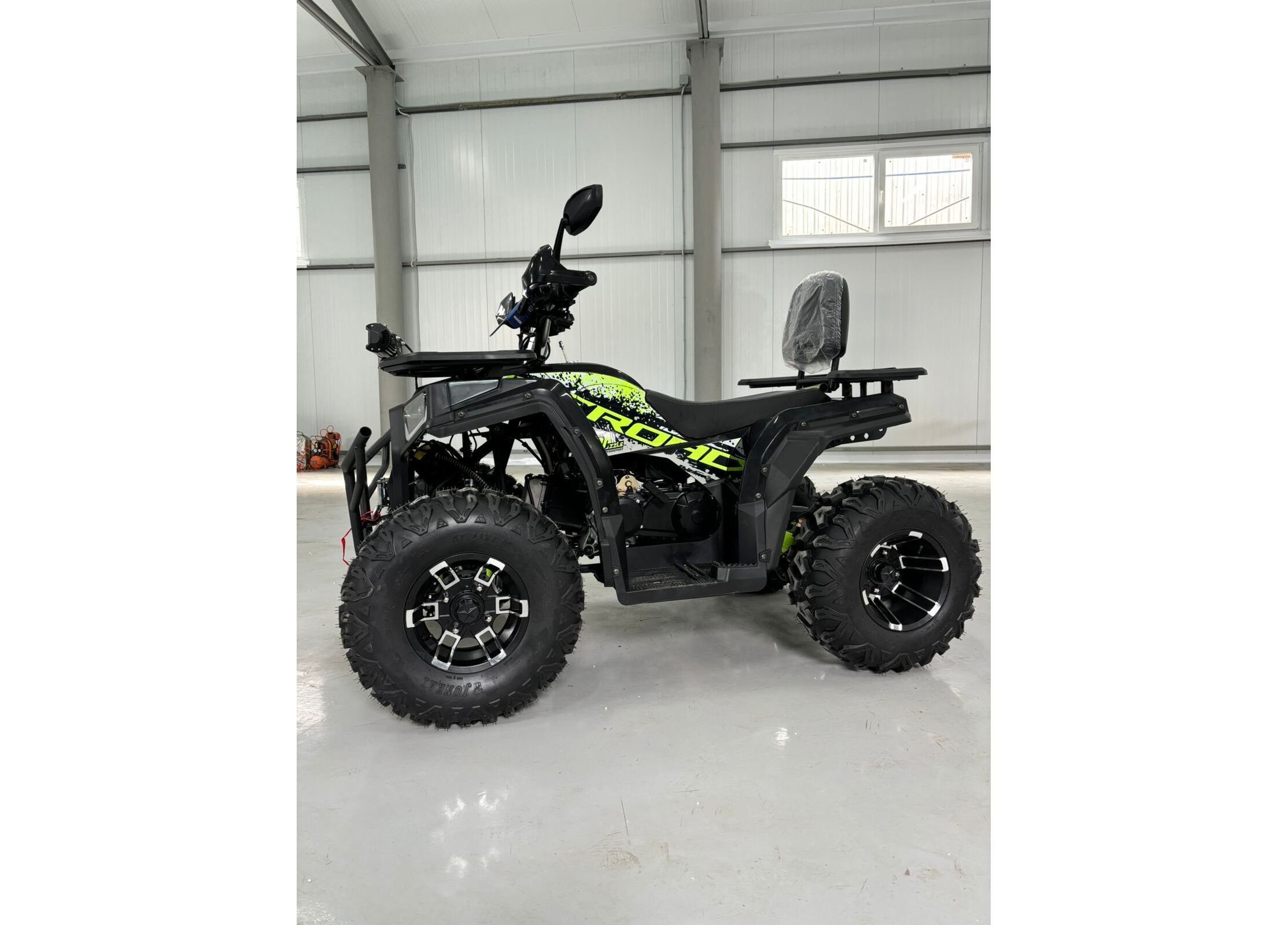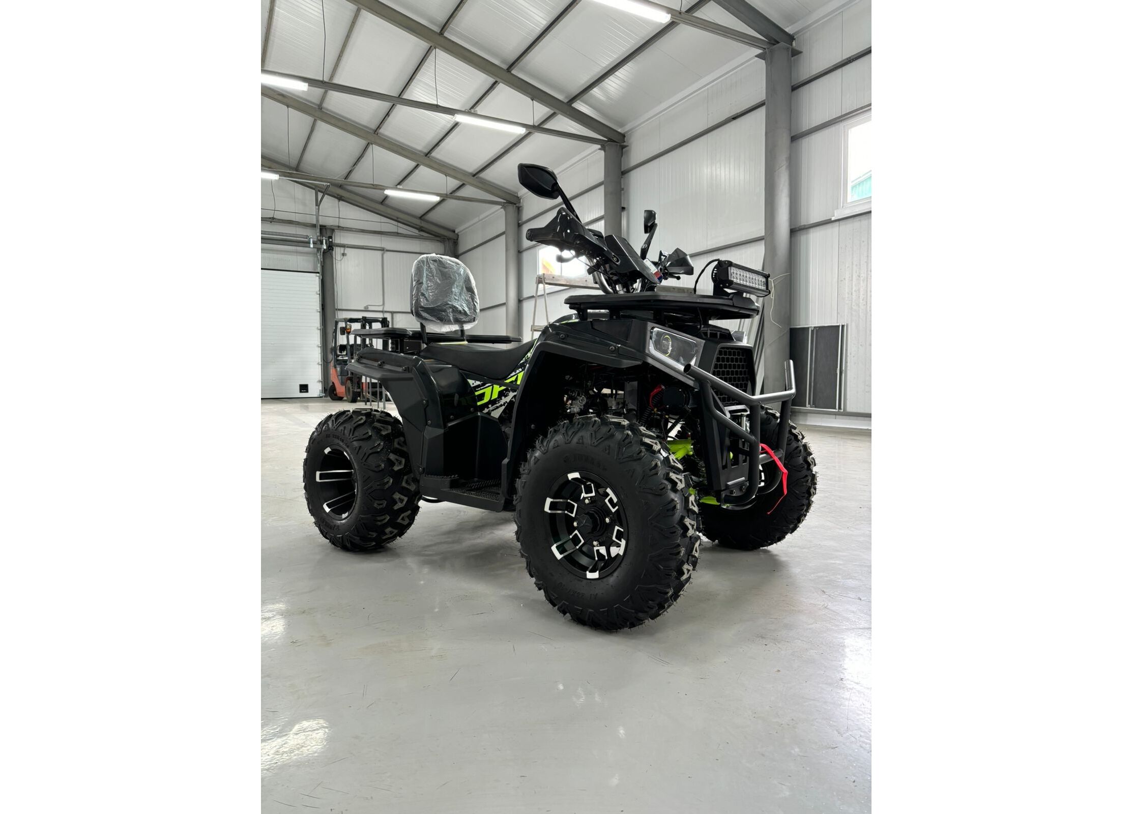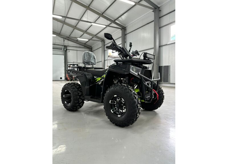 Практичность дополняют металлические багажники спереди и сзади, спинка для пассажира, защита рук, зеркала заднего вида, лебедка с кнопочным управлением и фаркоп. Объём топливного бака составляет 7,8 литра, максимальная грузоподъемность — до 200 кг. Габариты квадроцикла — 1840 x 1100 x 1160 мм при высоте по седлу 900 мм и весе 195 кг, что делает его удобным как для отдыха, так и для работы.