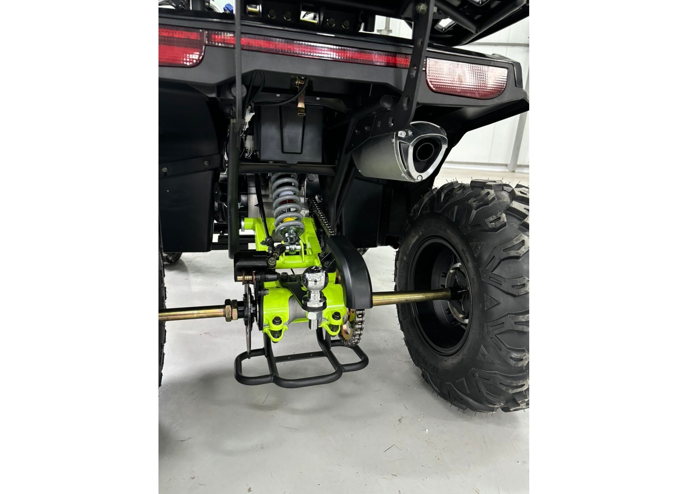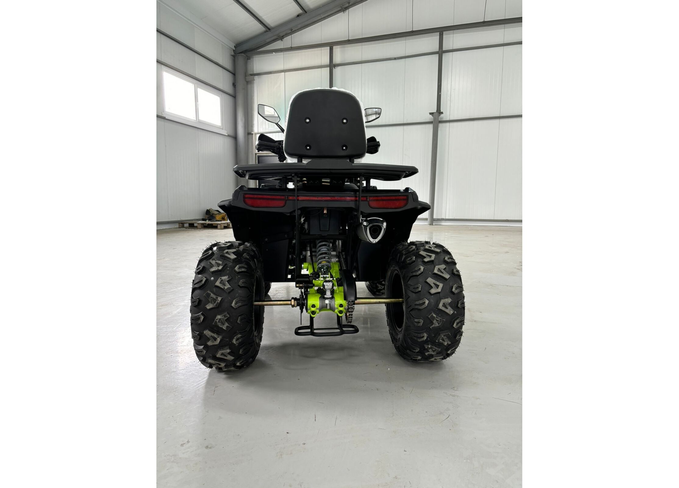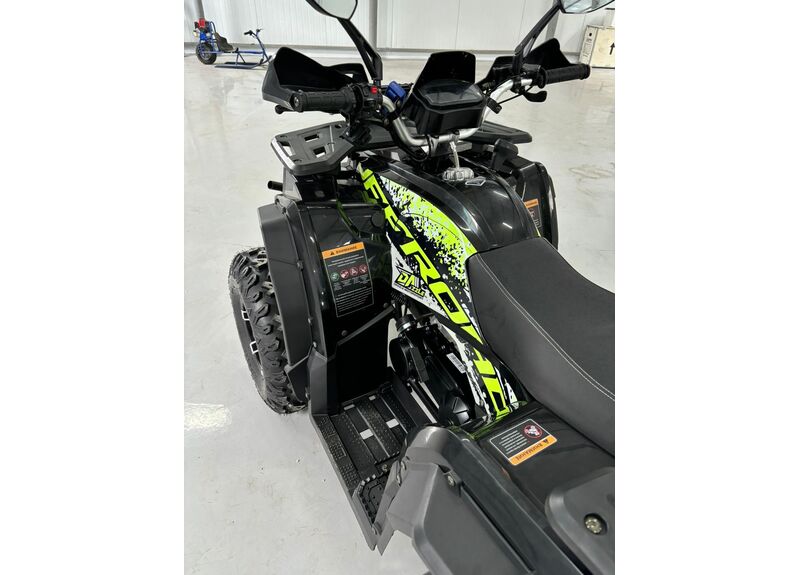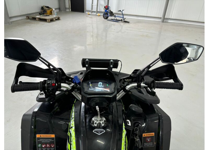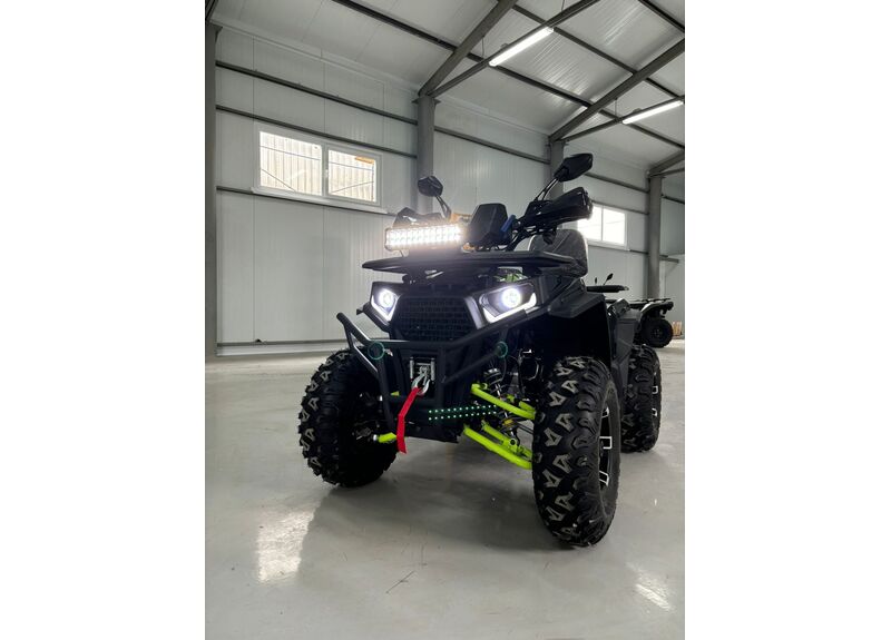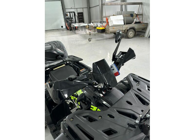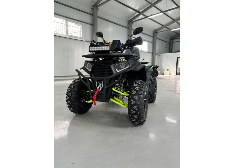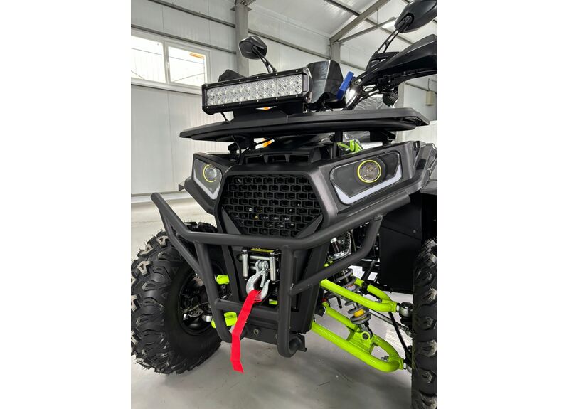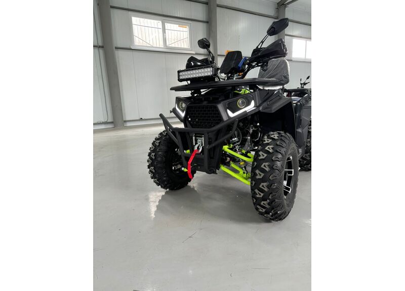 Передача мощности осуществляется через цепной привод на заднюю ось с надёжной защитой, натяжителем и цепью типа 530. Трансмиссия — вариаторная с режимами движения вперёд, нейтраль и задний ход. Автоматическое сцепление и карбюраторная система подачи топлива делают управление квадроциклом простым и интуитивно понятным, а электронное зажигание C.D.I и система запуска с электростартером и кик-стартером обеспечивают надёжный пуск двигателя в любых условиях.