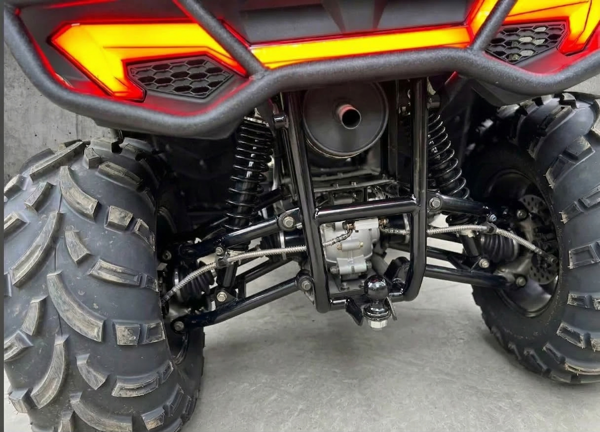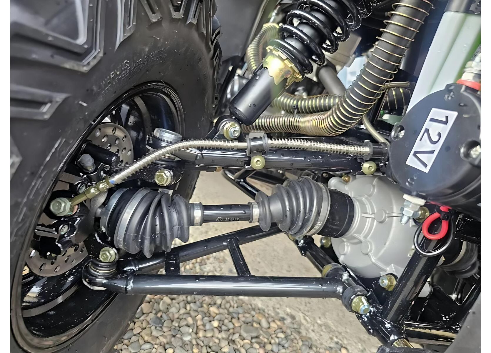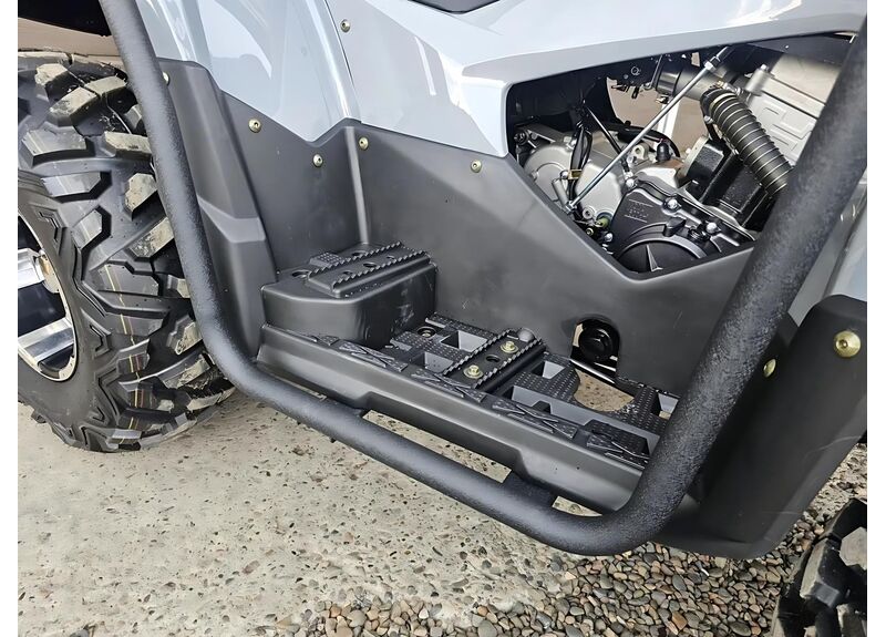 В управлении и комфорте помогают электроусилитель руля, независимая двухрычажная подвеска спереди и сзади с регулируемыми газомасляными амортизаторами, а также двухместное сиденье со спинкой. Колёса 25" (перед 25x8-12, зад 25x10-12) на литых алюминиевых дисках рассчитаны на внедорожный протектор и сцепление.