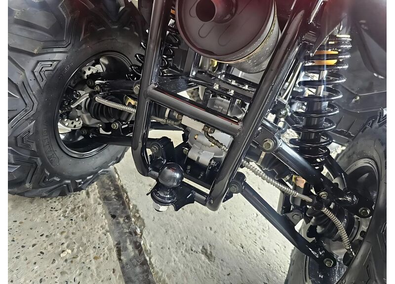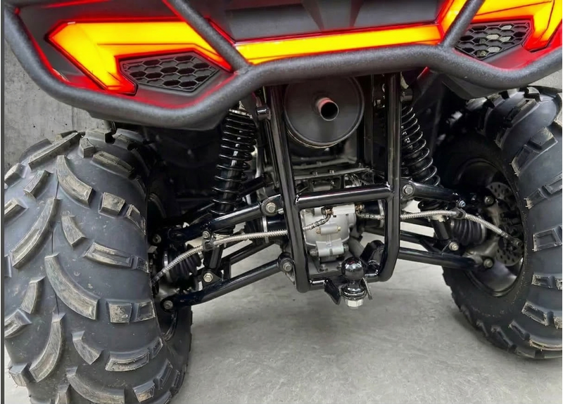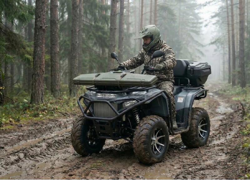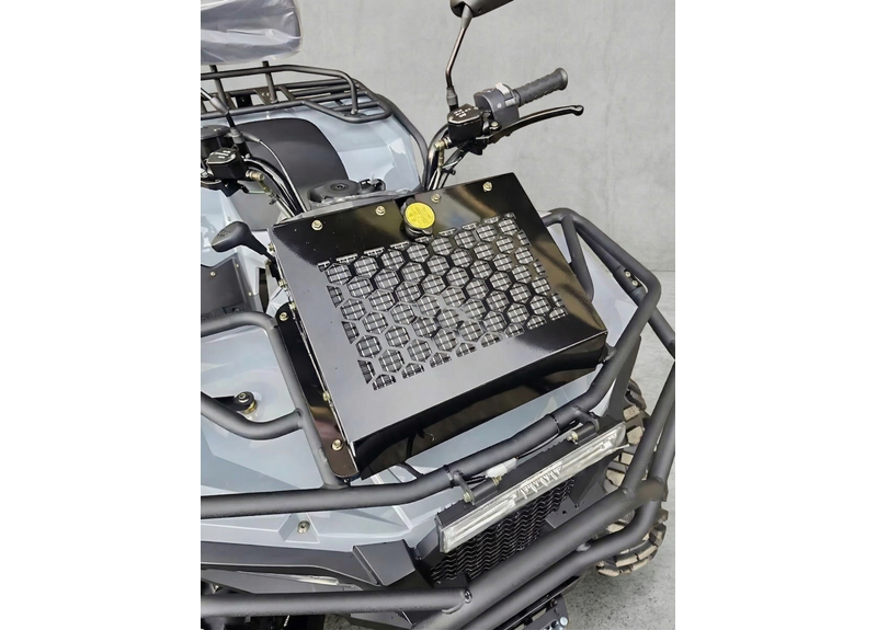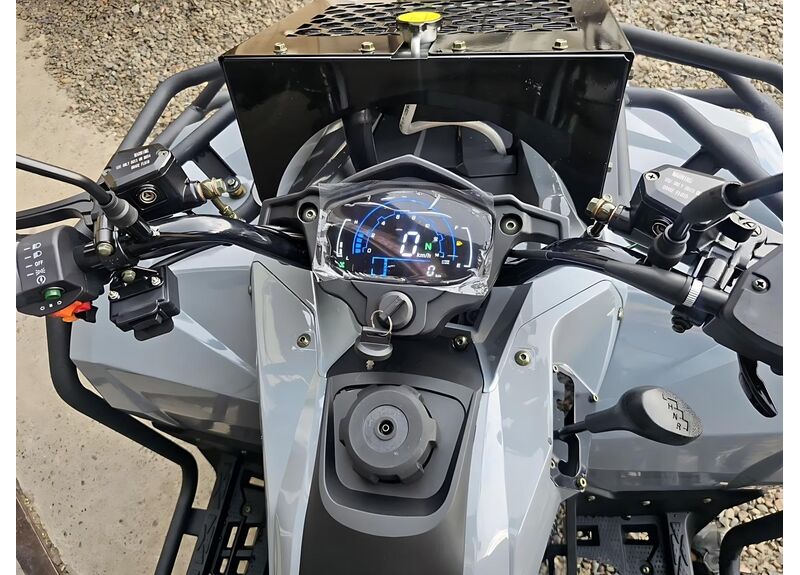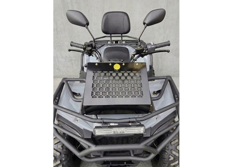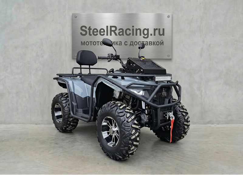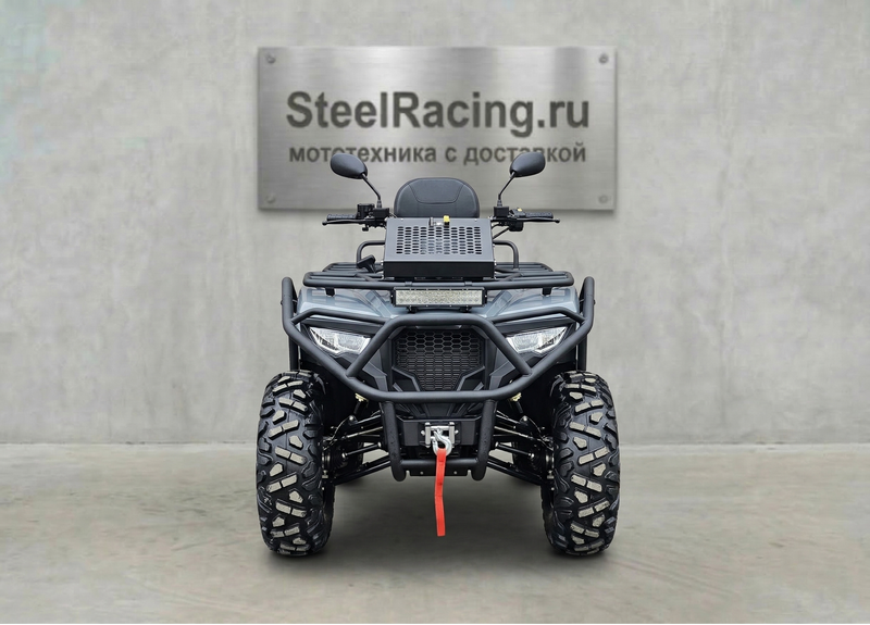 По оснащению: светодиодная оптика (ближний/дальний), поворотники и аварийка, электронная приборная панель с индикацией режимов и температуры охлаждающей жидкости, лебёдка с управлением на руле, багажники спереди и сзади. Топливный бак — 14 л. После покупки рекомендуется заменить заводское транспортировочное масло в двигателе/трансмиссии и в редукторах.
