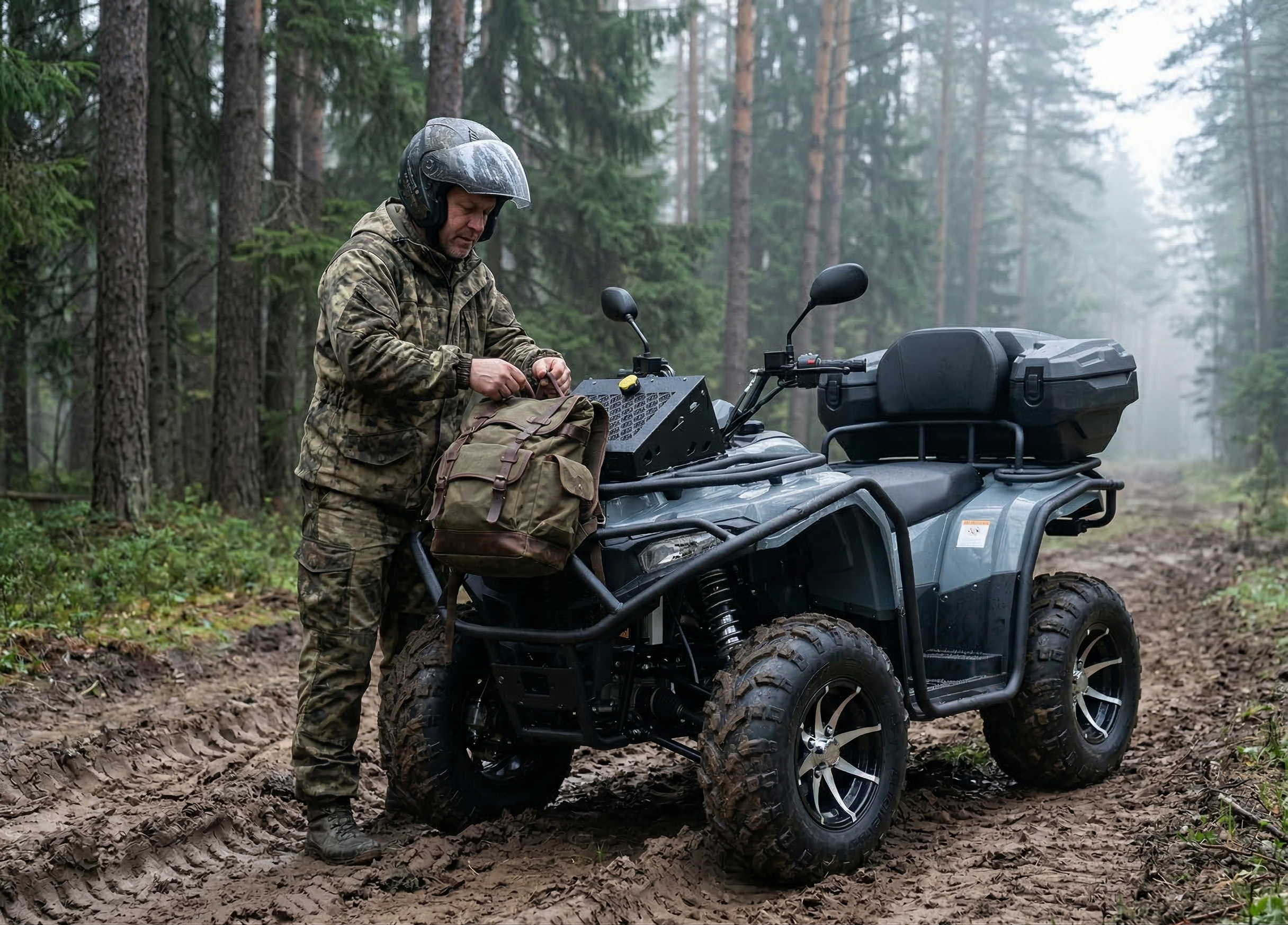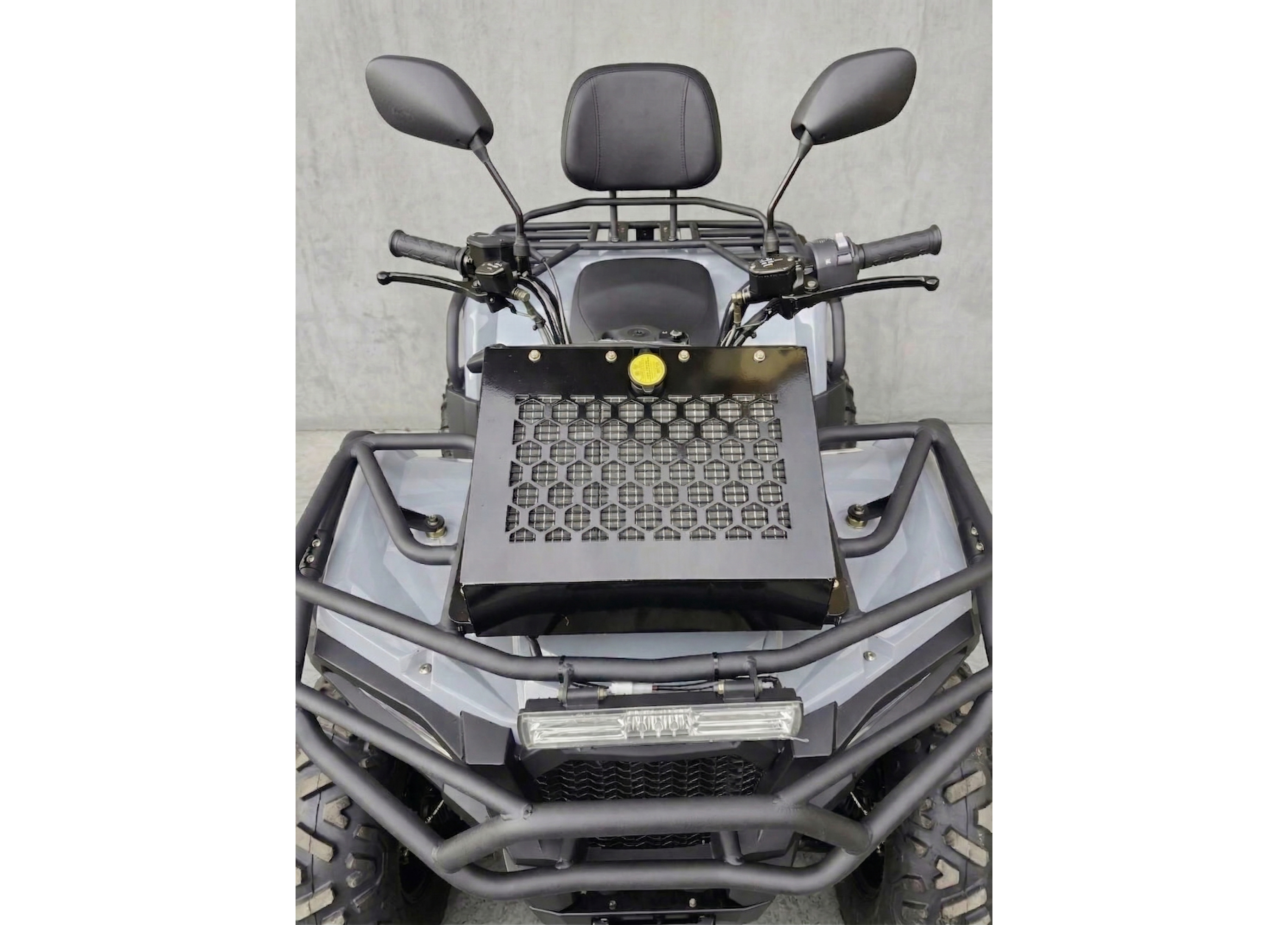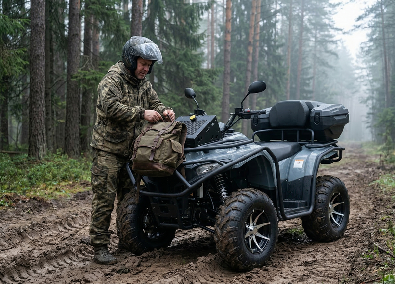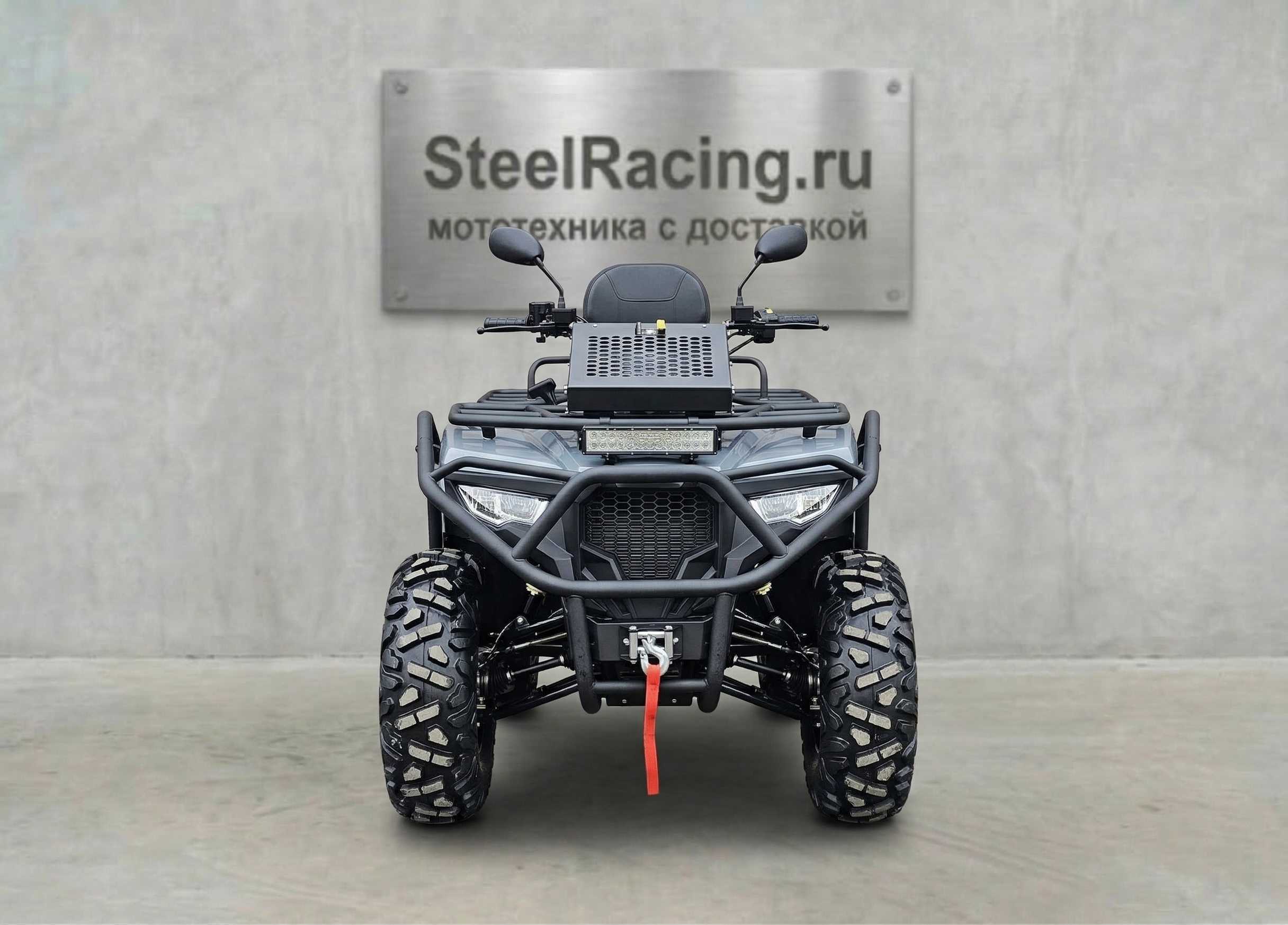 По оснащению: светодиодная оптика (ближний/дальний), поворотники и аварийка, электронная приборная панель с индикацией режимов и температуры охлаждающей жидкости, лебёдка с управлением на руле, багажники спереди и сзади. Топливный бак — 14 л. После покупки рекомендуется заменить заводское транспортировочное масло в двигателе/трансмиссии и в редукторах.