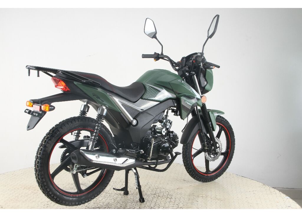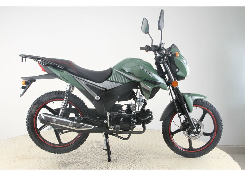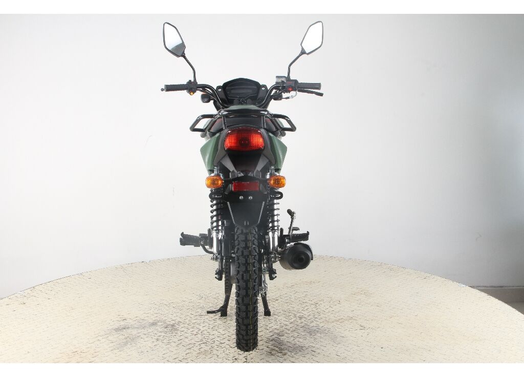 За безопасность отвечает связка тормозов: передний дисковый гидравлический и задний барабанный. Такое сочетание даёт более уверенное замедление спереди и простую в обслуживании заднюю часть. Вседорожная резина 2.50–17 спереди и 2.75–17 сзади добавляет зацепа на асфальте и на укатанной грунтовке.
