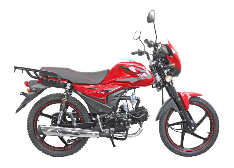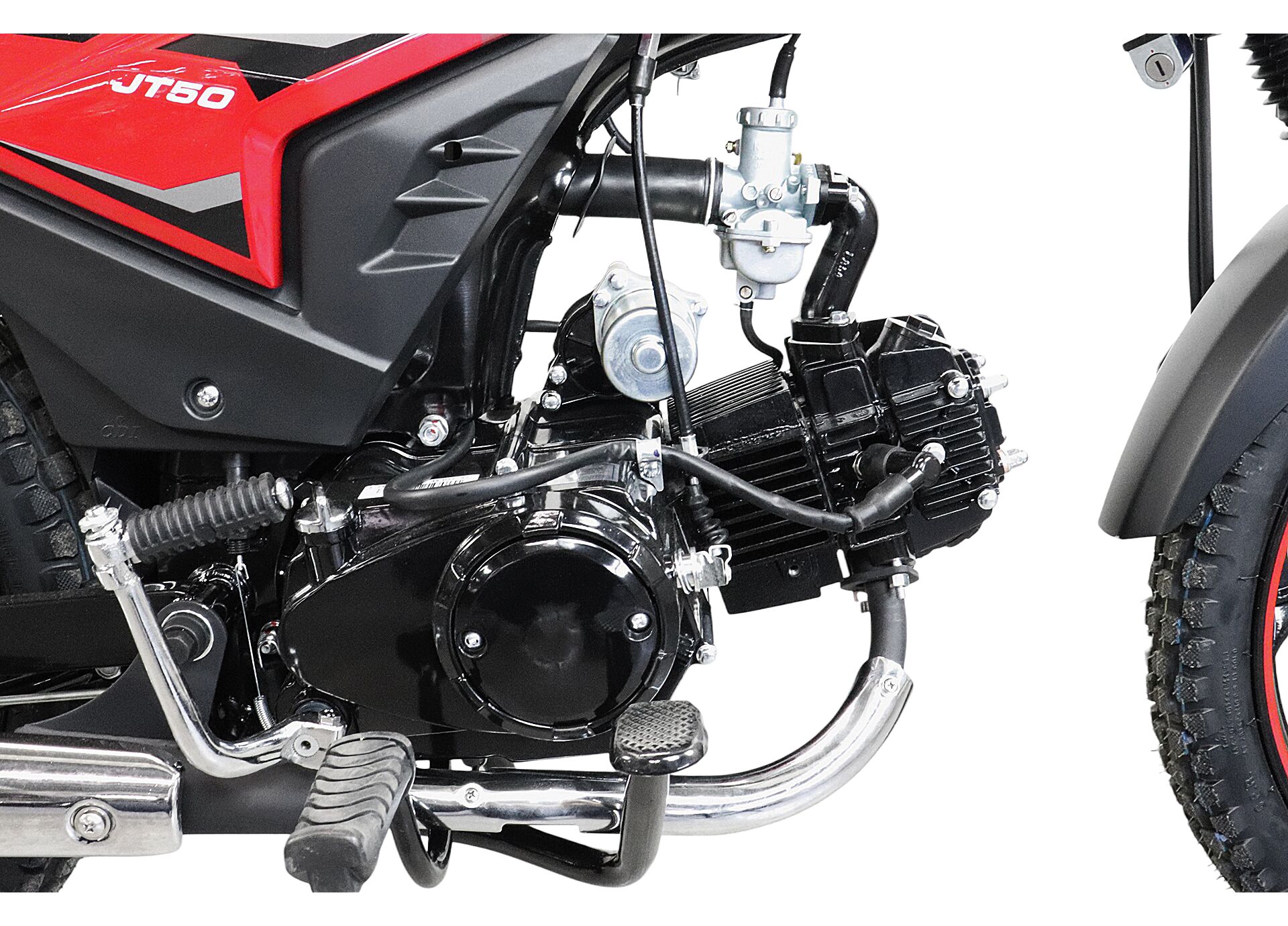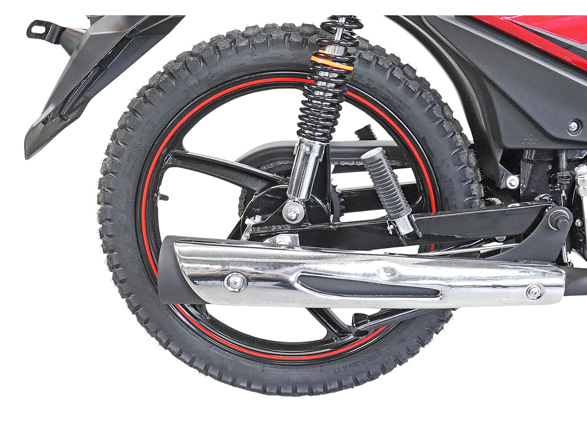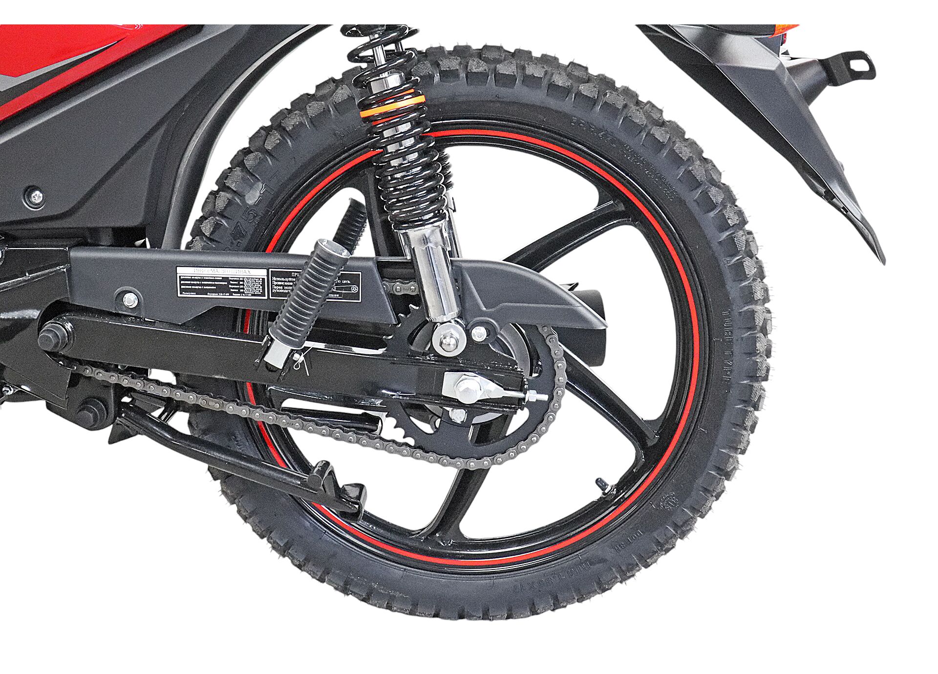 Трансмиссия со сцеплением (схема 1-N-2-3-4) помогает точнее дозировать тягу на низких скоростях и на подъёмах по сравнению с автоматическими решениями. Колёса 17" с шинами 2.5-17 спереди и 2.75-17 сзади — привычный формат для мопедов с «мотоциклетной» посадкой.