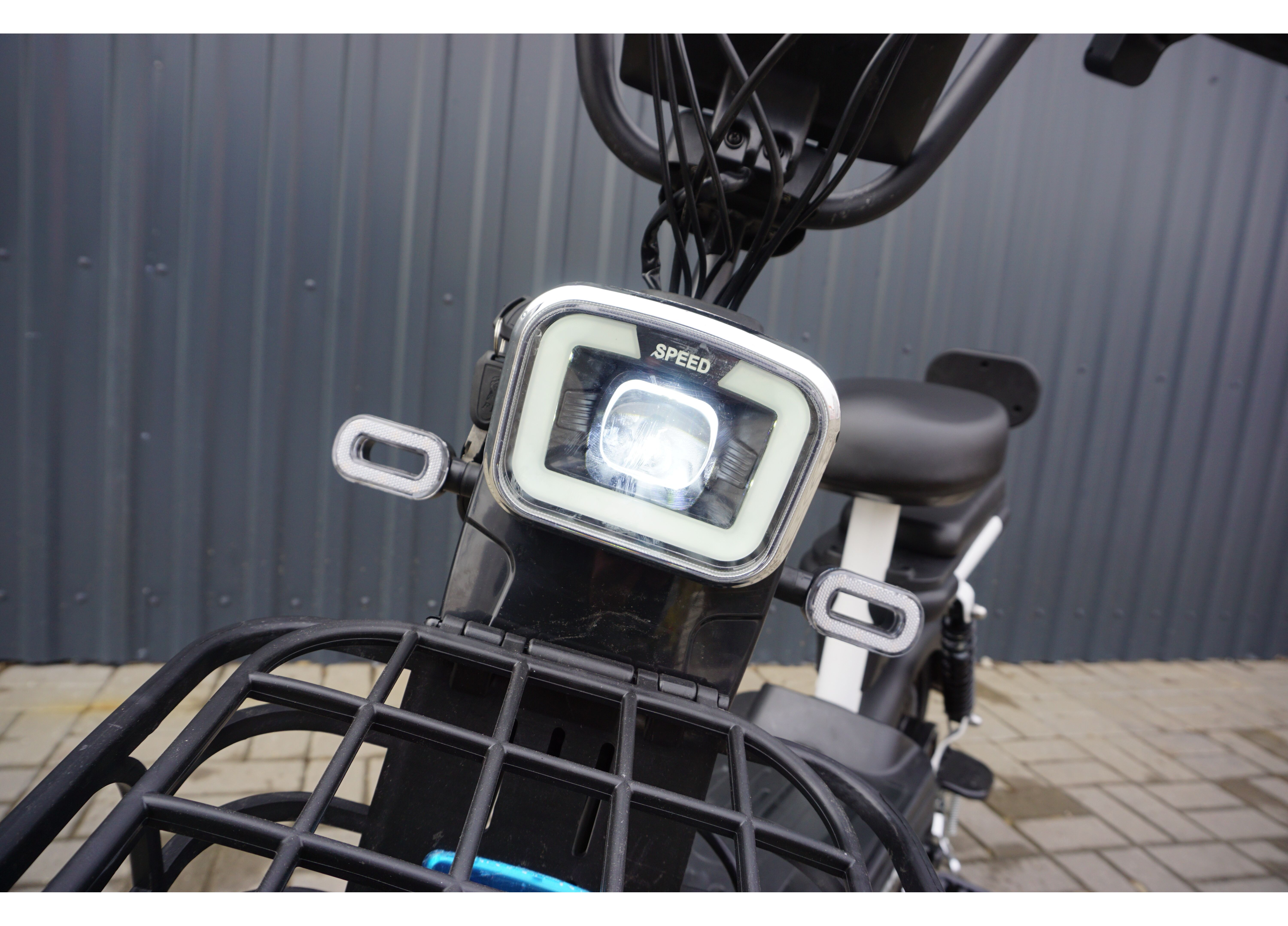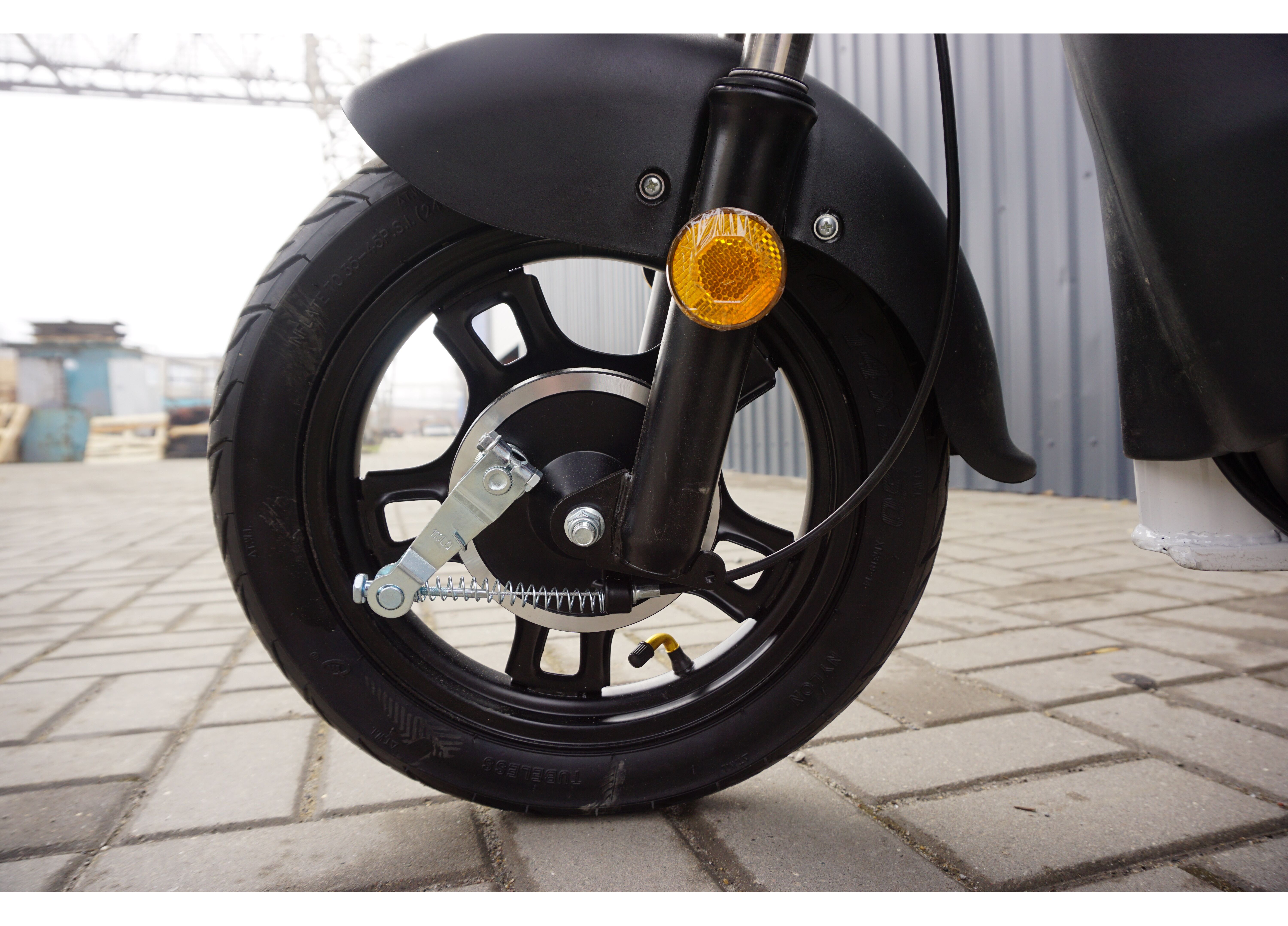 Безопасность гарантируют барабанные тормоза (передний и задний) с рекуперацией, светодиодная фара, указатели поворотов и сигнализация с дистанционным запуском. Для удобства – многофункциональный ЖК-дисплей, багажная корзина и задние амортизаторы для комфорта на неровных дорогах.