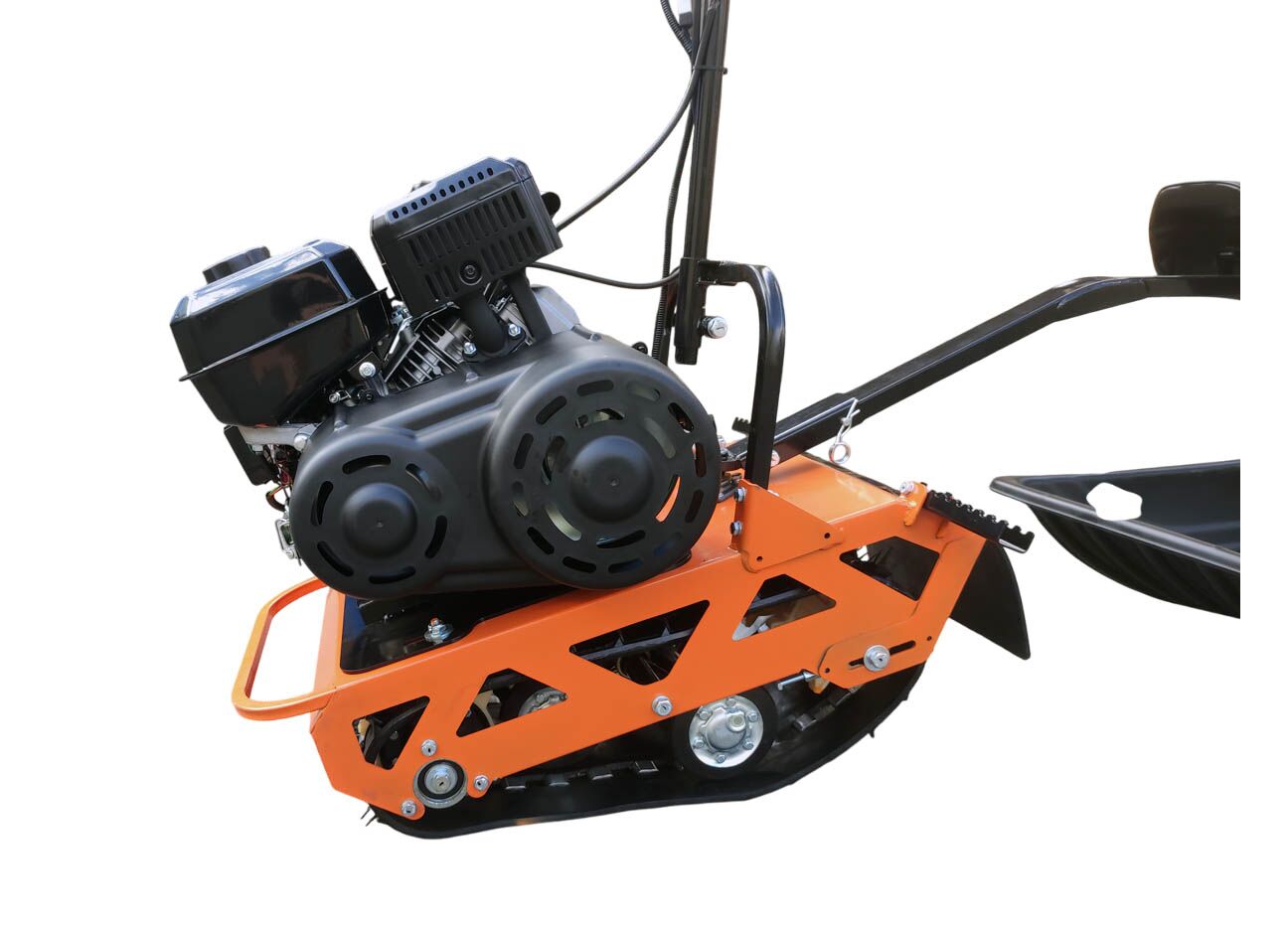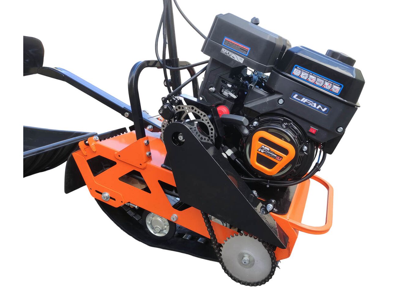Установлен двигатель LIFAN KP270 мощностью 10 л.с., трансмиссия — вариатор TAV2-40. Для движения используется гусеница Композит Буран шириной 380 мм (1/2), подвеска — катковая.