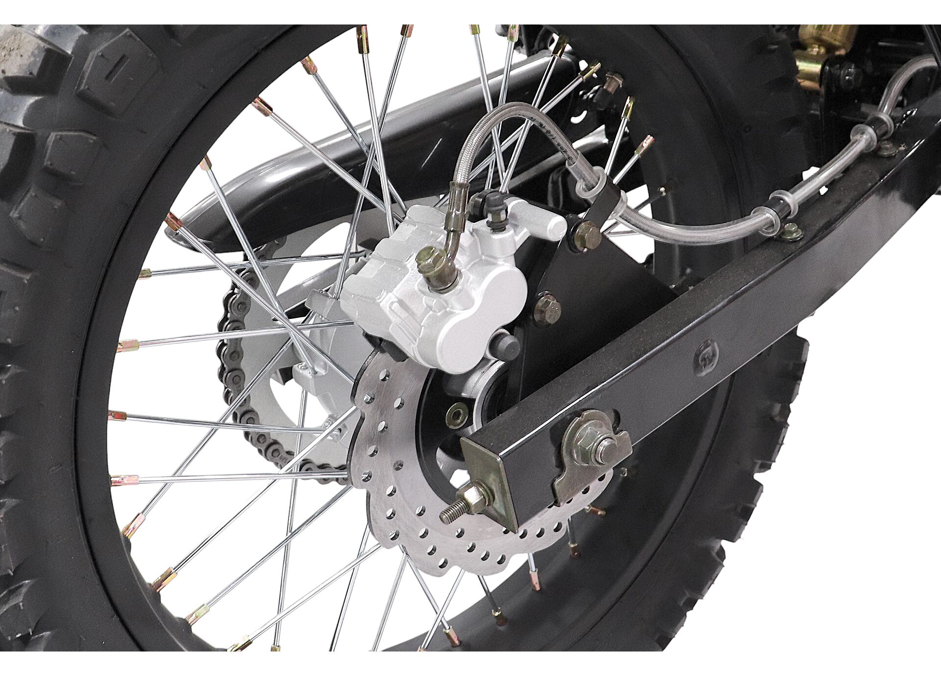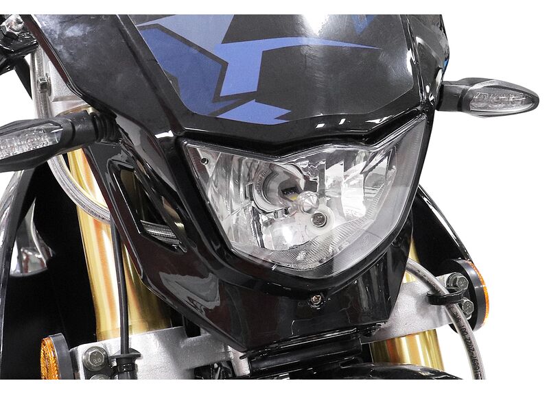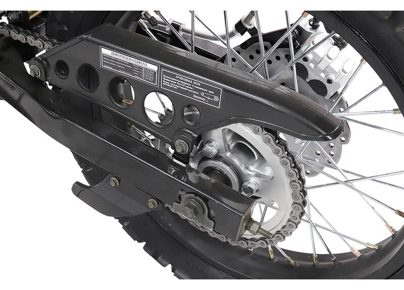 Для контроля на грунте и в колее предусмотрены дисковые гидравлические тормоза спереди и сзади, а также телескопическая вилка перевёрнутого типа. Колёсная формула 21/18 с размерами шин 90/100‑21 спереди и 120/90‑18 сзади — практичный выбор для эндуро, когда важны проходимость и устойчивость на неровностях.