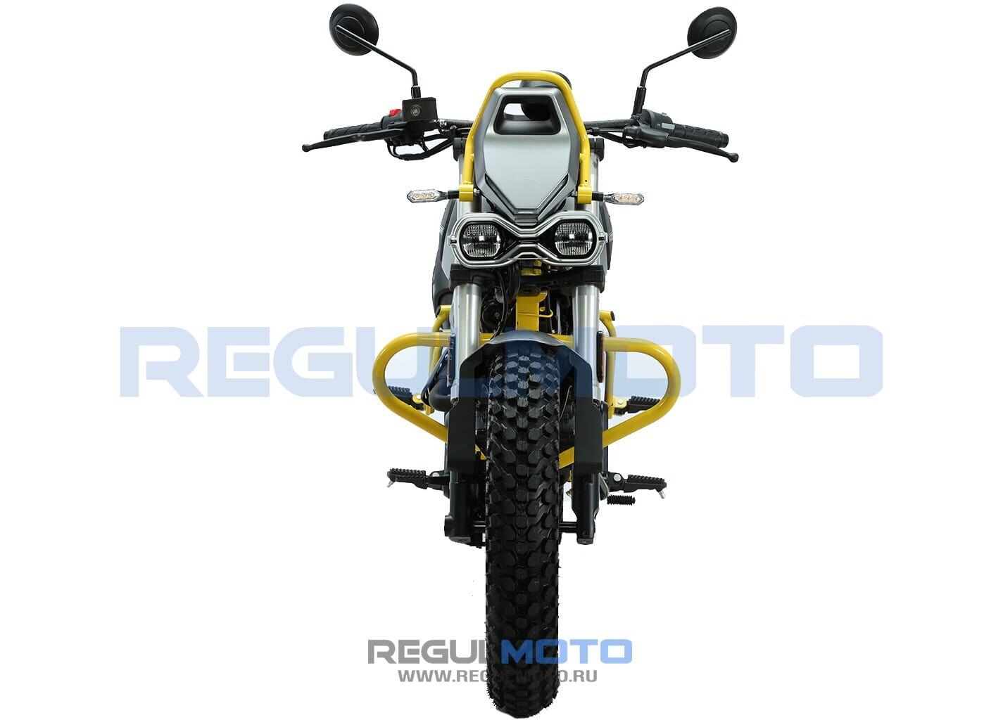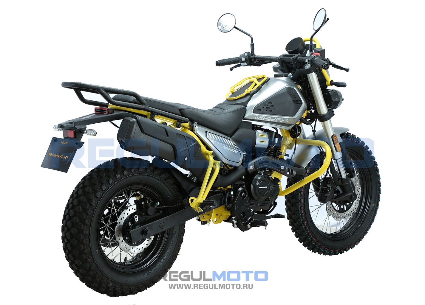 Regulmoto WIZARD подходит тем, кому нужен мотоцикл для смешанных маршрутов: грунтовки, разбитый асфальт, лесные и дачные дороги. Внедорожный класс и колесная формула с широкими шинами 130/80-18 спереди и 180/80-14 сзади дают более уверенное поведение на рыхлом и неровном покрытии по сравнению с дорожной резиной.