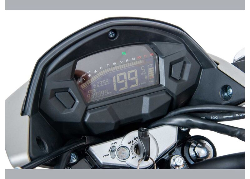 По посадке и геометрии модель удобна для повседневных маршрутов: высота по седлу 800 мм, колёсная база 1350 мм, масса 120 кг. Есть 2 места и подножки пассажира, максимальная нагрузка — 150 кг. Из оснащения: электронная LCD-панель, стоп-сигнал. Дорожный просвет 320 мм, но защиты картера нет — если планируются плохие дороги, это стоит учесть заранее.