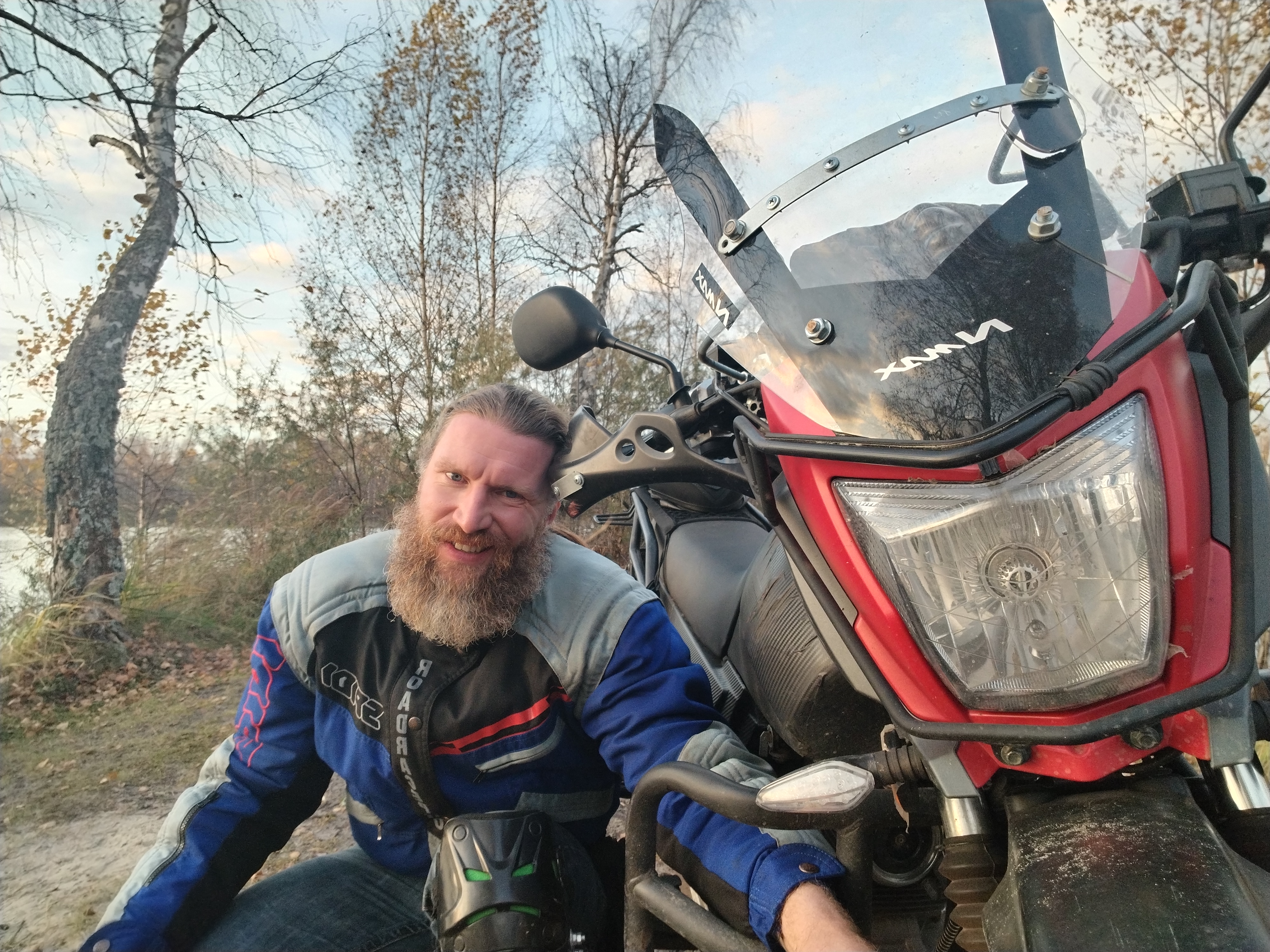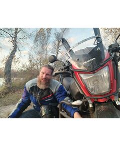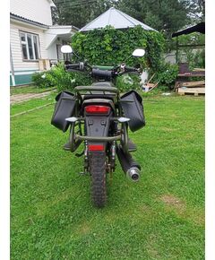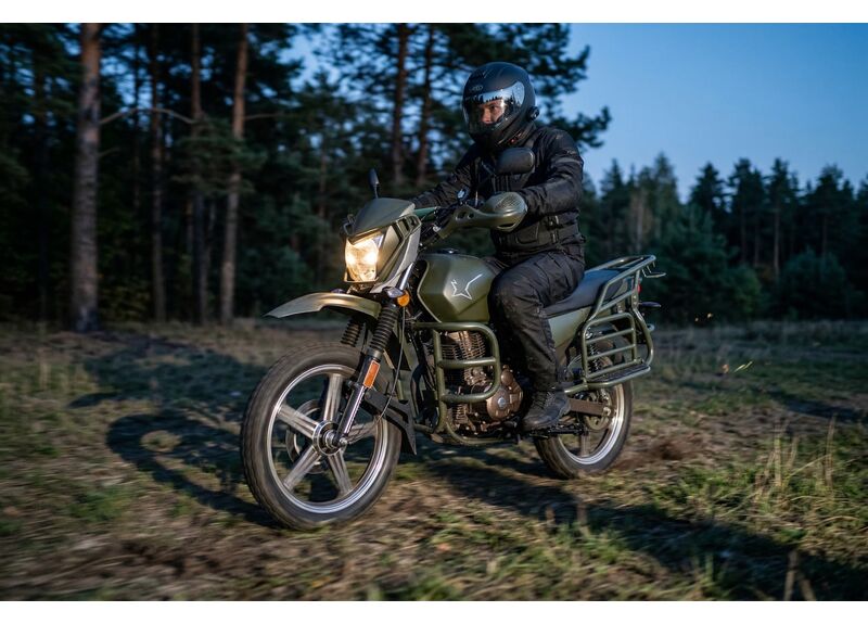 - Передняя часть больше напоминает кроссовый байк, в частности, высоко задранным крылом, щитками на руле, защищающими кисти. Фара защищена не только пластиковым корпусом, но и металлической рамкой, закрывающей ее по периметру. Лампа LED в головной фаре отличается экономичностью и надежностью. Такой источник света дает равномерный яркий пучок, которого хватает для безопасной езды на всем диапазоне скоростей мотоцикла. Боковые поворотники все на диодных лампах, отличаются современным дизайном.