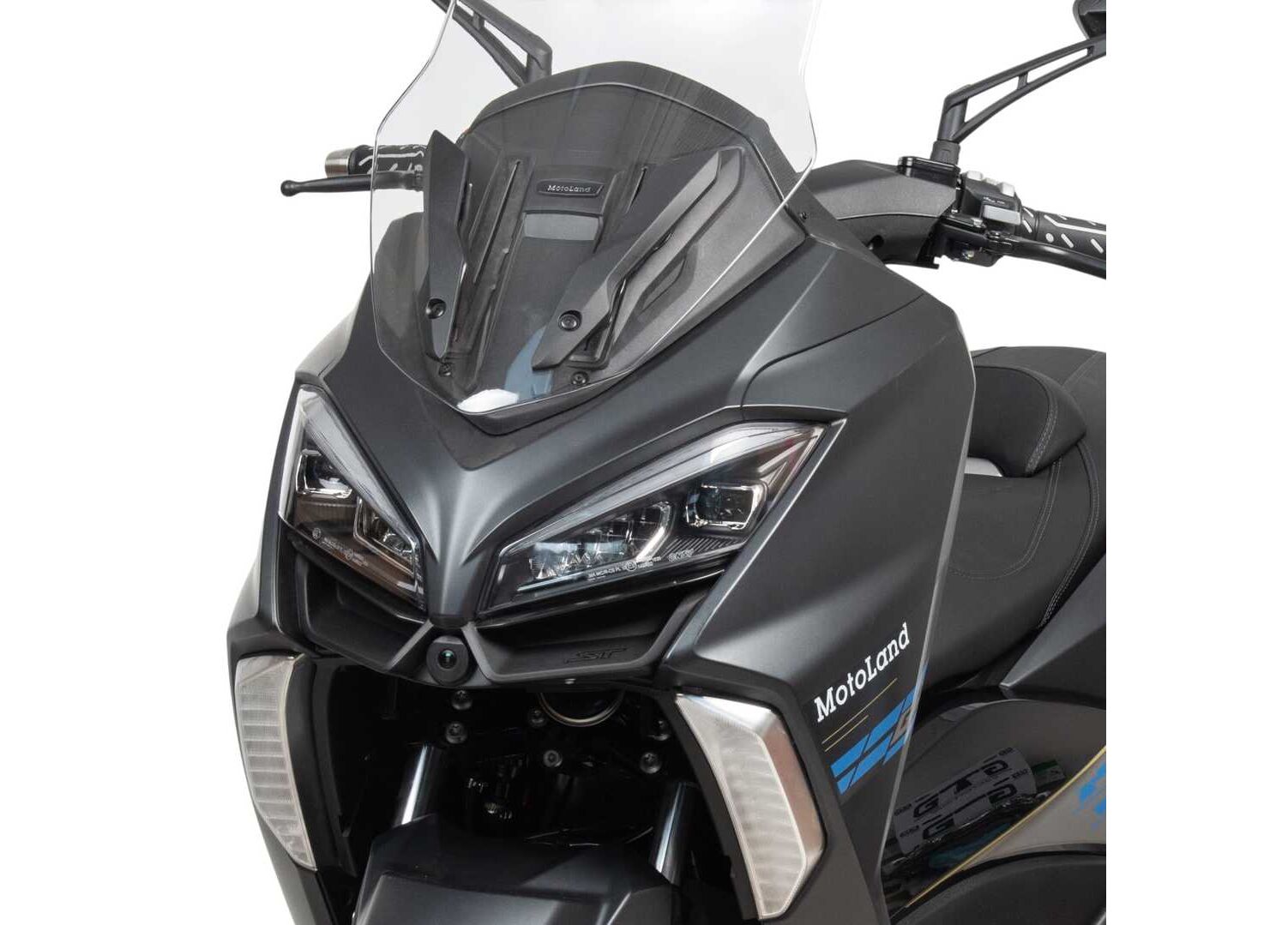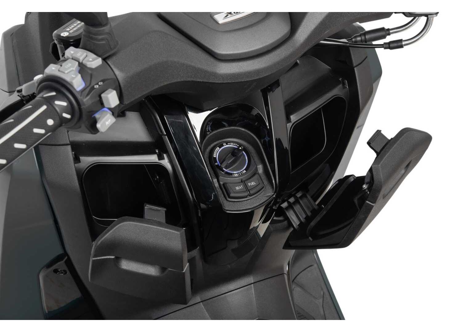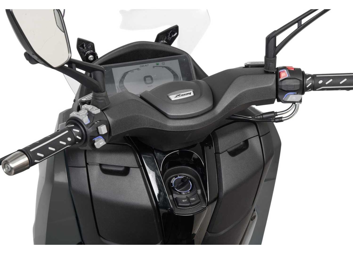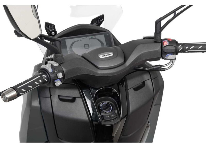 В оснащении — полное светодиодное освещение (включая линзованную LED-фару), LCD-приборная панель и система Keyless (бесключевой доступ) с аварийным режимом зажигания, позволяющим запустить двигатель при разряженном брелоке. Для комфорта предусмотрено регулируемое ветровое стекло (электропривод регулировки по высоте, 2 позиции), передние отделения для мелочей с USB-портом, подключение к мобильному телефону и камера, которую можно использовать как видеорегистратор. Также есть багажник и подножки пассажира.