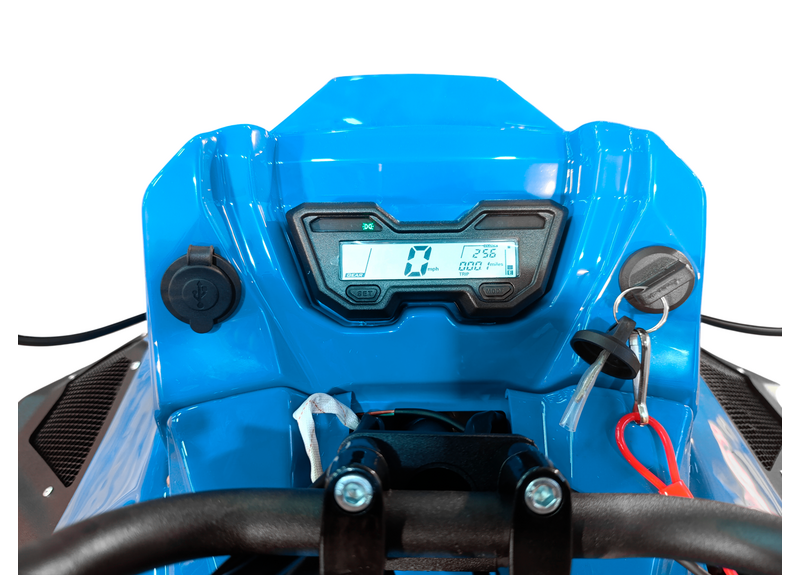 Важные параметры для подбора: сухая масса — 218 кг, высота по седлу — 715 мм, объём бака — 18 л, рекомендуемое топливо — бензин с октановым числом не ниже 92, максимальная скорость — 50 км/ч. Доступны два варианта цвета облицовок: синий и белый. Заявлена гарантия 2 года или 1000 км.