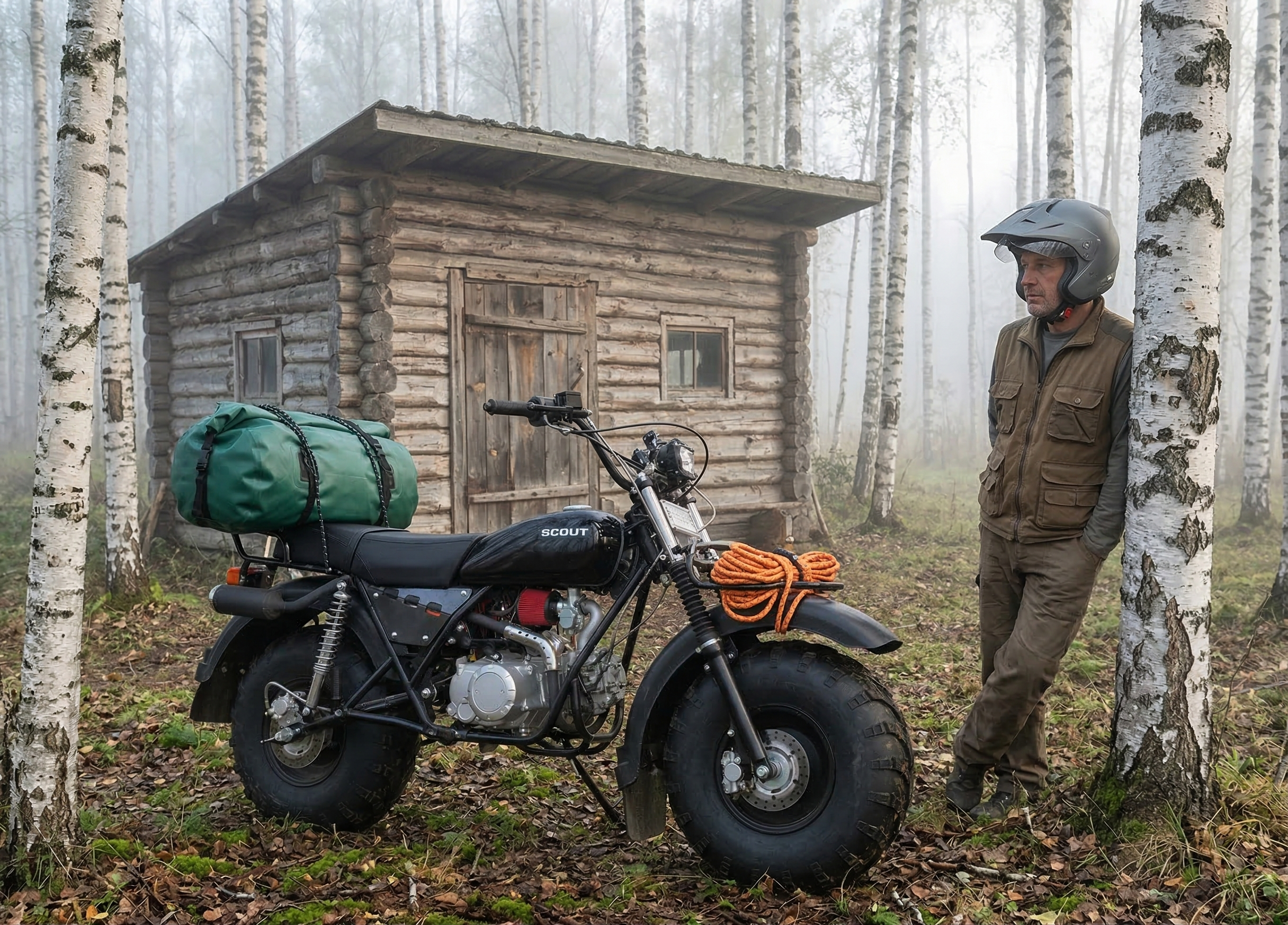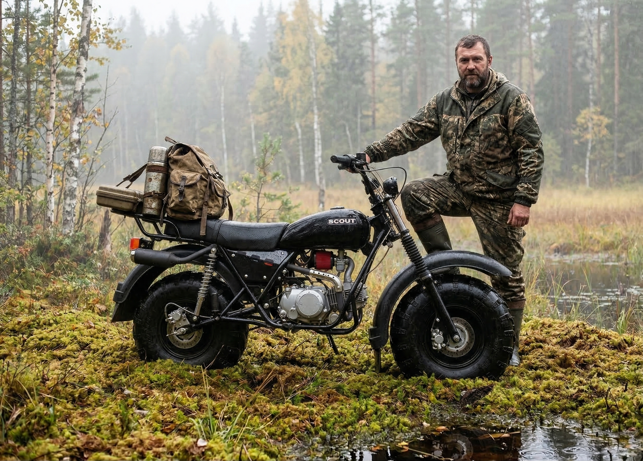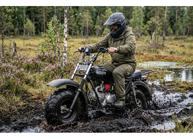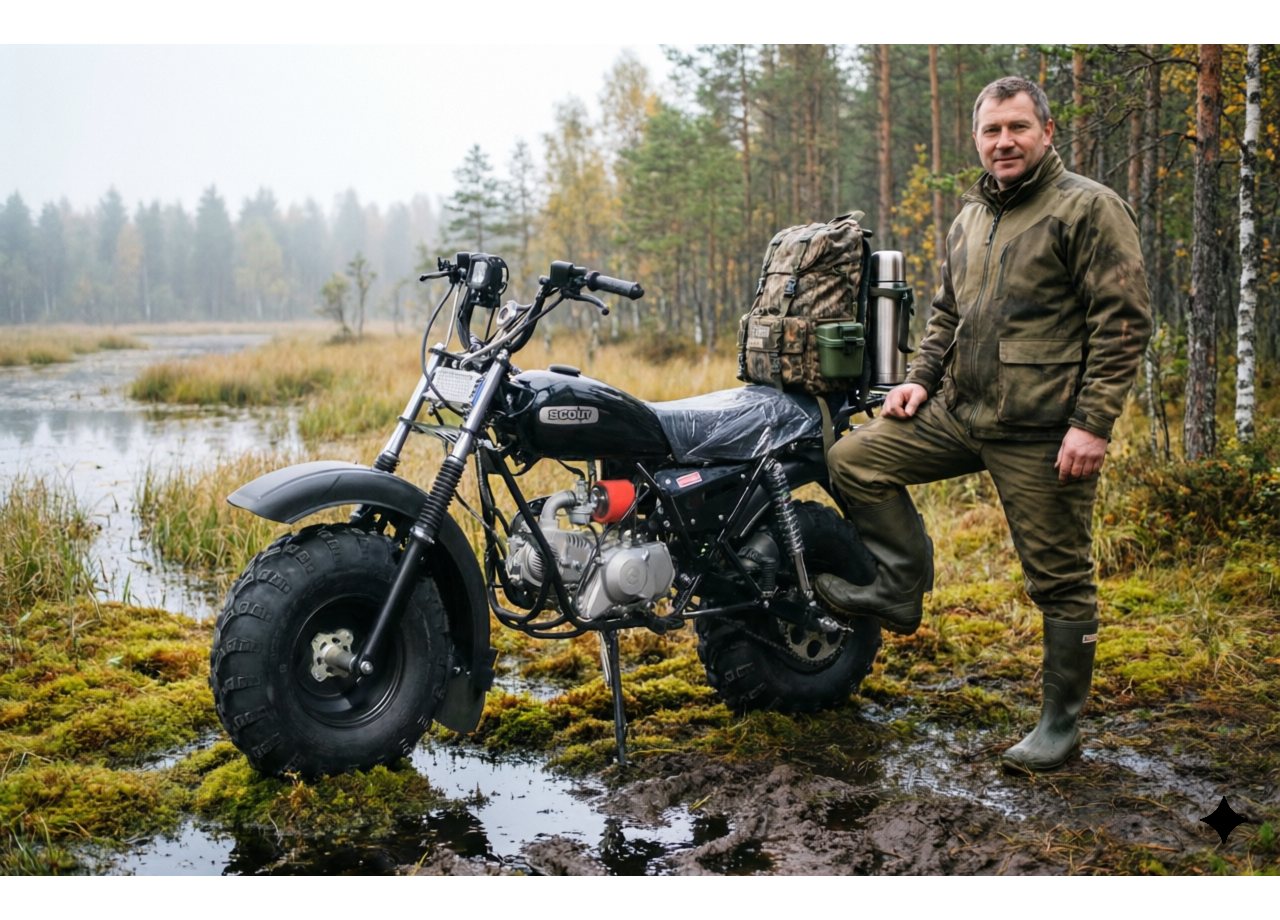 СКАУТ-3 выбирают как альтернативу квадроциклу для охоты, рыбалки и хозяйственных задач: проходимость обеспечивают большие колёса низкого давления с грунтозацепами, а конструкция рассчитана на утилитарную эксплуатацию круглый год и в любую погоду.