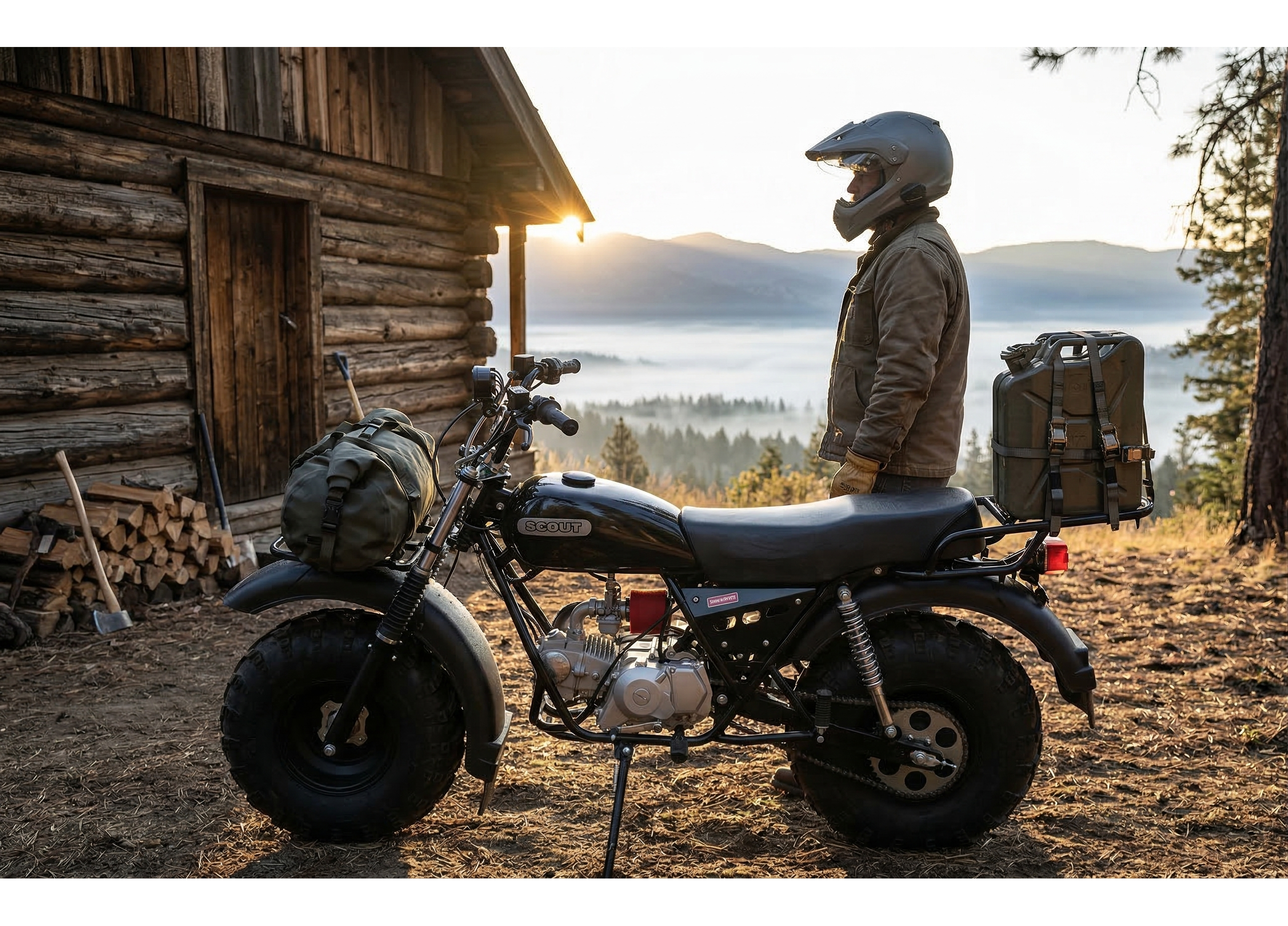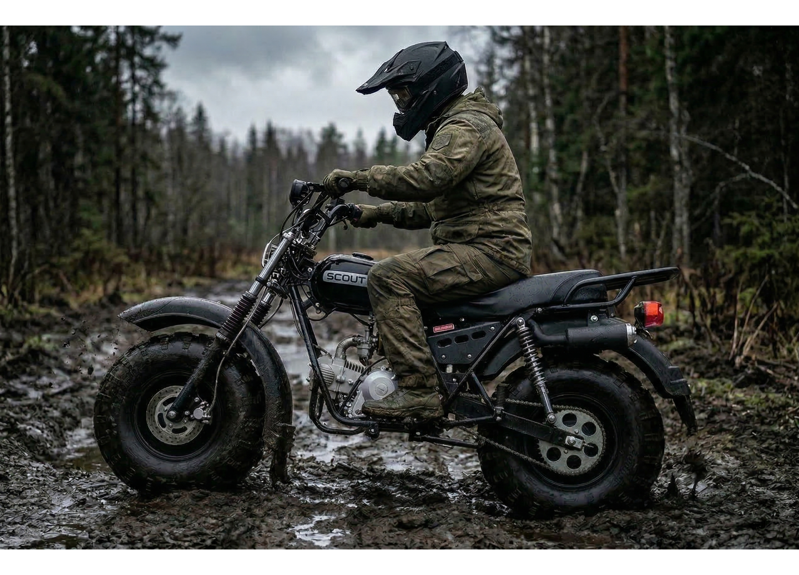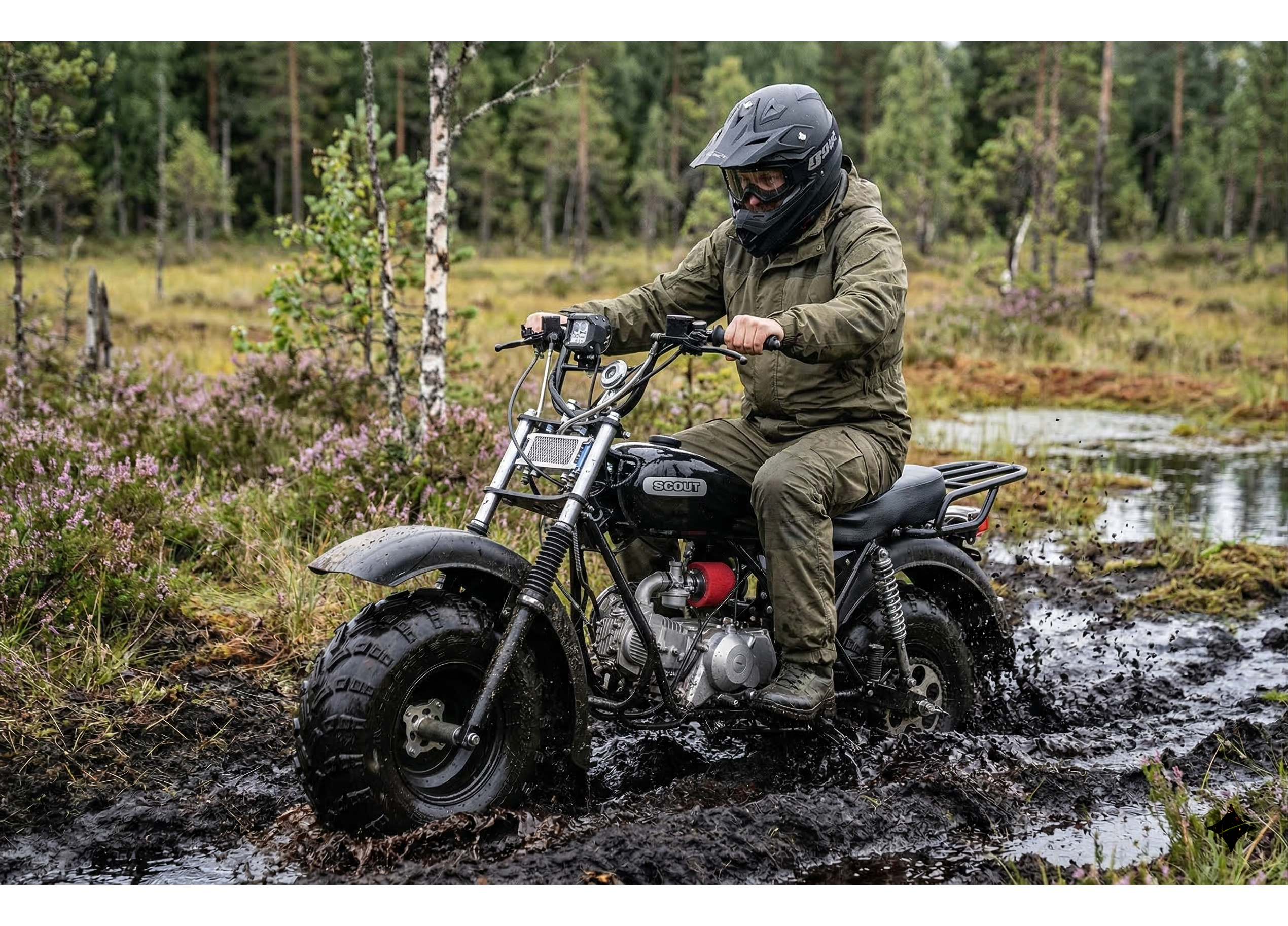 СКАУТ-3 выбирают как альтернативу квадроциклу для охоты, рыбалки и хозяйственных задач: проходимость обеспечивают большие колёса низкого давления с грунтозацепами, а конструкция рассчитана на утилитарную эксплуатацию круглый год и в любую погоду.